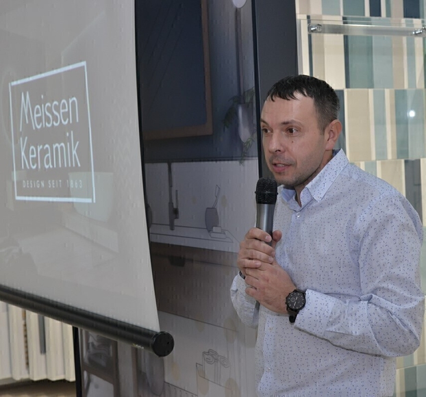 Руководитель отдела продаж Уральского федерального округа направления керамической плитки компании Cersanit Андрей Середин представил гостям продукцию бренда Meissen Keramik. Он рассказал о том, чем вдохновлялись дизайнеры при создании роскошных коллекций и как богатая европейская история нашла отражение в текстурах отделочного материала.