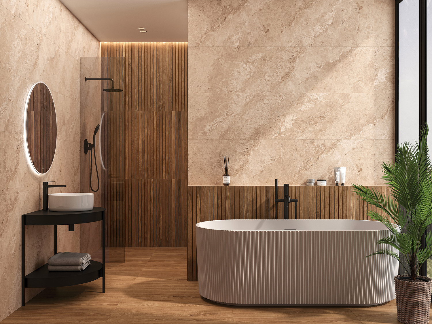 Спокойный бежевый камень лёг в основу коллекции керамогранита Asher. Рельефная матовая текстура придаёт ему объема, а интерьеру — фундаментальной величественности. Тёплый оттенок делает плитку уютной и домашней, а спокойный рисунок текстуры позволяет использовать её для заполнения больших пространств. Уложенный с минимальным швом керамогранит формата 45х90 будет радовать красотой и практичностью долгие годы.