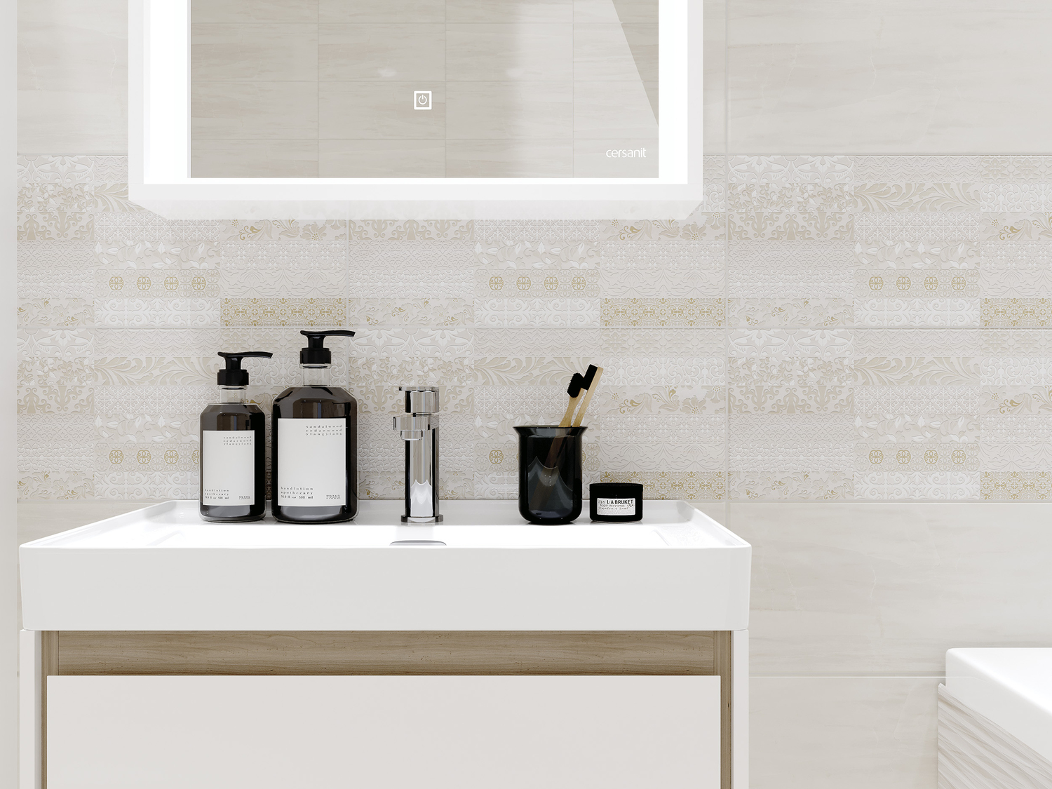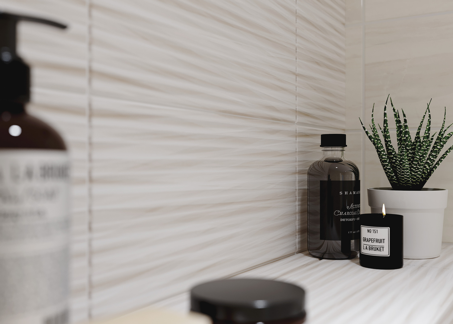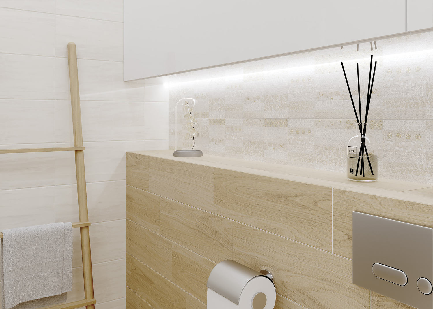 Деликатная светло-бежевая гамма глянцевой коллекции ATRIA позволит визуально увеличить пространство ванной. Базовая плитка воспроизводит фактуру травертина. На плитке с рельефом в виде горизонтальных полос рисунок камня более выражен, что делает поверхность динамичной. В коллекцию вошли декоративные элементы двух видов. Первый с нежным узором в стиле пэчворк, украшенным люстром, и второй в виде широких мазков матовой и блестящей глазури. Комбинация декоров и фактур этой коллекции позволит создать поистине изысканный и изящный интерьер ванной.