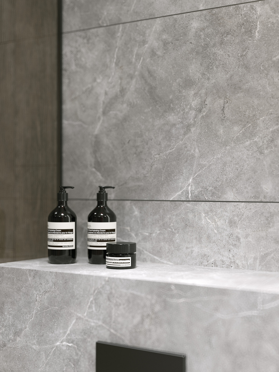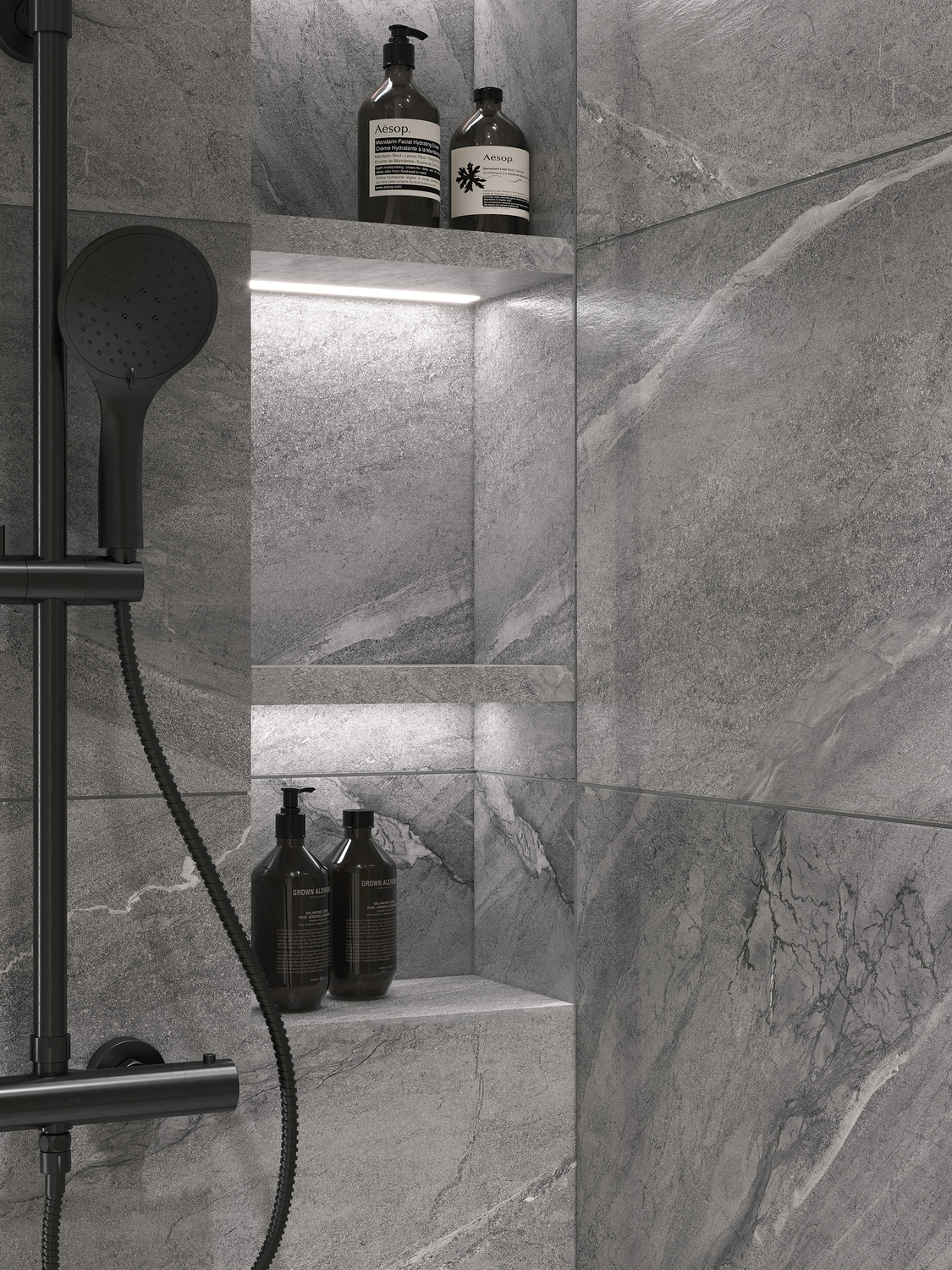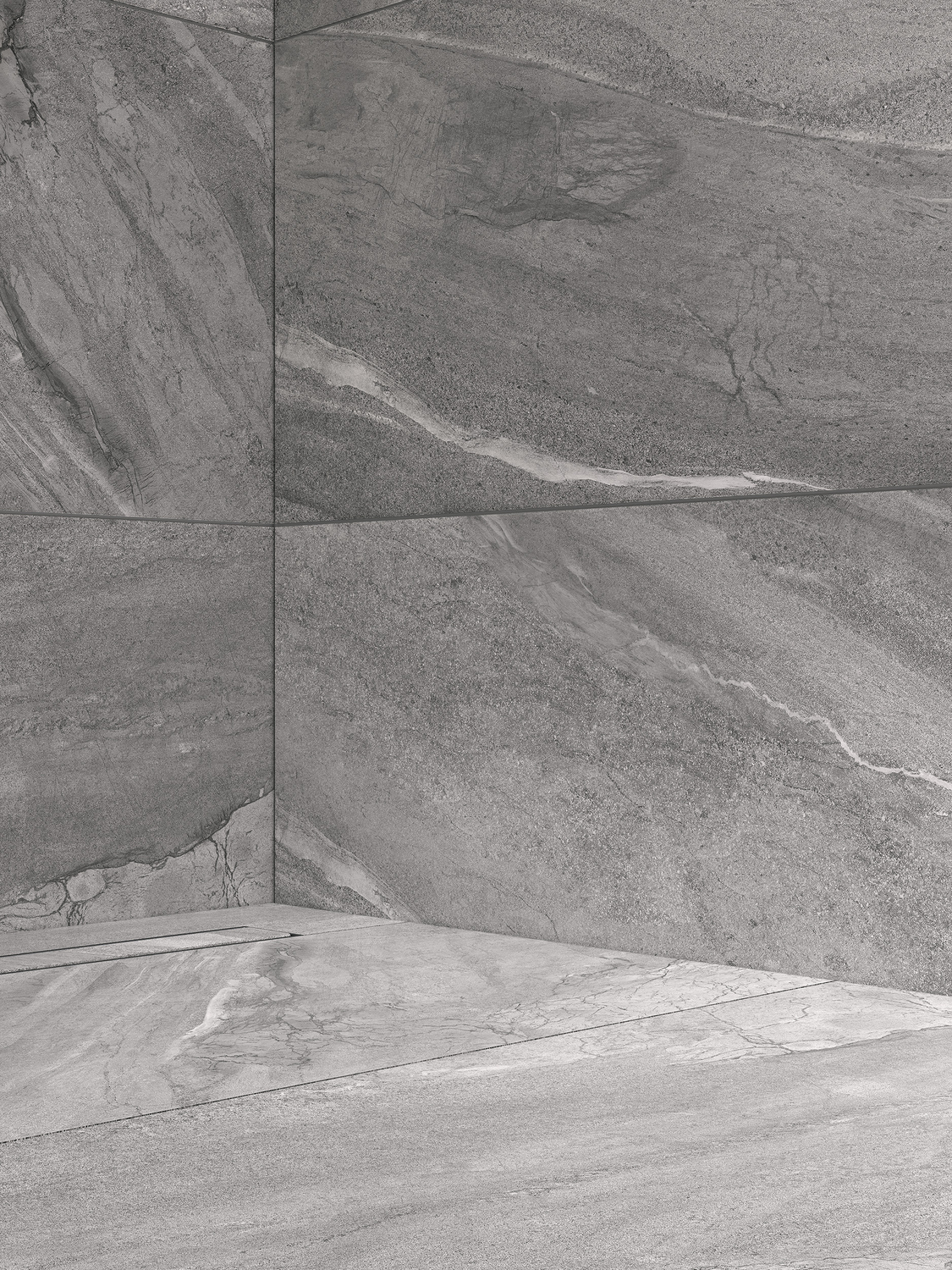Керамогранит Castello — это реалистичная имитация тёмно-серого камня. Шугар-эффект на поверхности создаёт объём и усиливает натуралистичность покрытия. Керамогранит — идеальное решение для мокрых зон. Этот материал прочен, износостоек, обладает противоскользящим эффектом и не боится влаги. Его можно укладывать вместе с системой «тёплый пол», а уход за ним прост и не требует использования агрессивной бытовой химии.