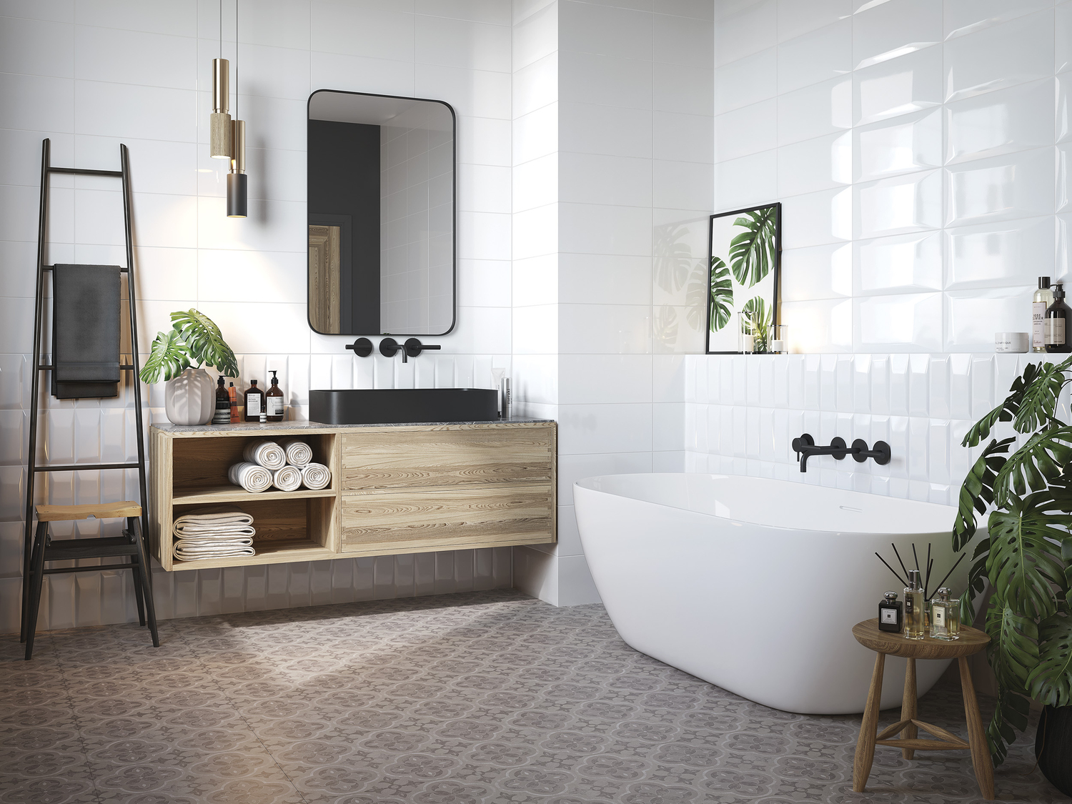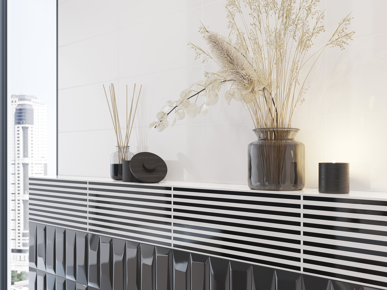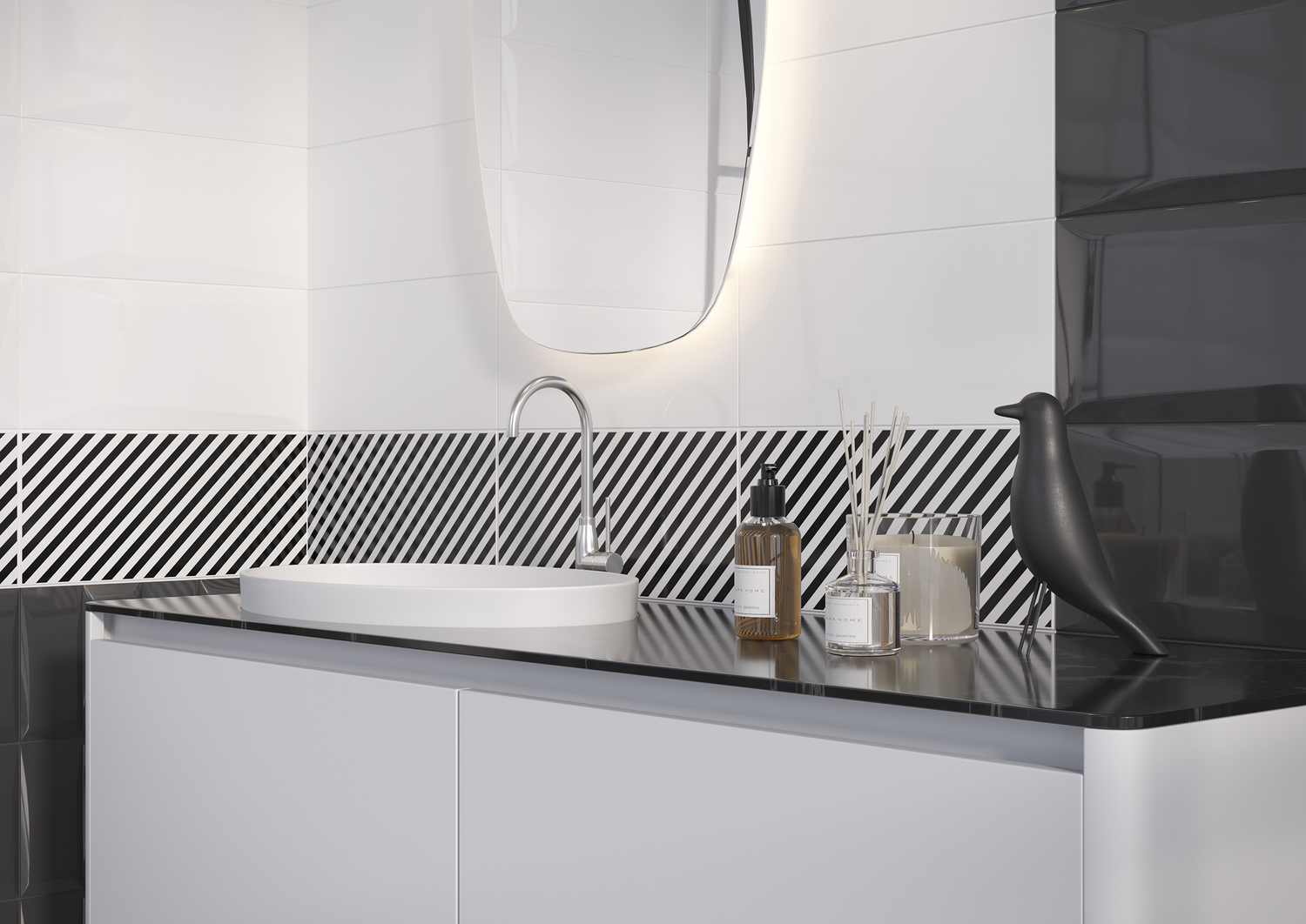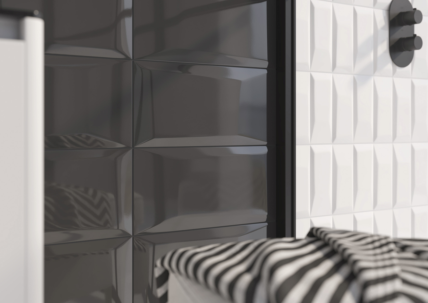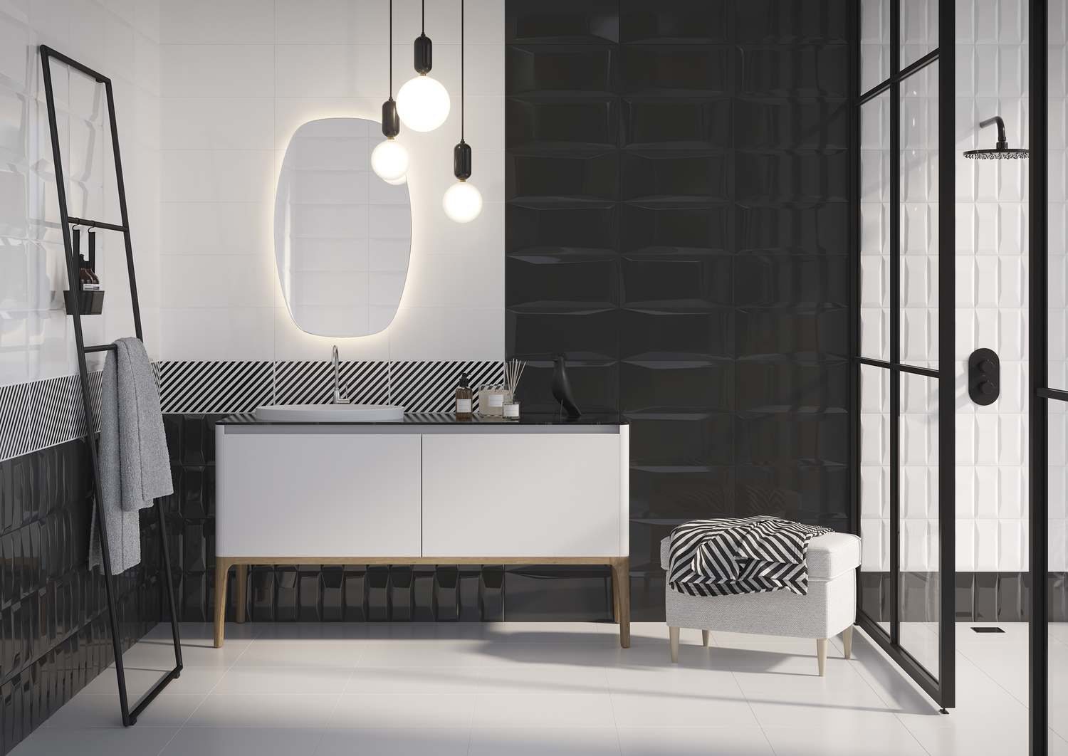 Универсальное сочетание чёрного и белого идеально подойдёт для оформления интерьера в стиле минимализм, арт-деко, хай-тек и авангард. Контрастная цветовая гамма поможет расставить акценты, а сочетание двух объёмов позволит эффективно выкладывать большие поверхности. «Кабанчики» и рельефы «даймонд» в чёрном и белом цвете наполняют пространство изящными световыми бликами. Декоративная плитка с графическим рисунком поставит акцент или визуально разграничит функциональные зоны. Усильте настроение пространства чёрным или белым керамогранитом либо придайте ему более классический вид с помощью напольной плитки «под дерево».