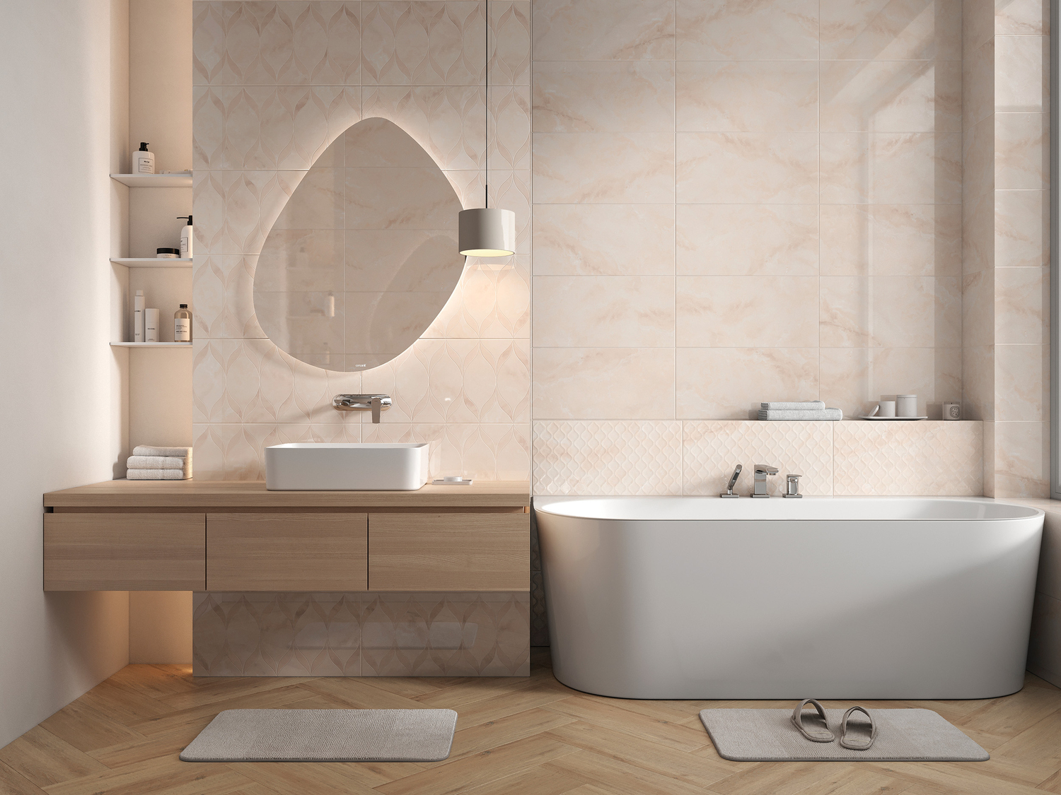 Декорация на м2 с вытянутыми лепестками в стиле современной классики упорядочивает своевольный узор базовой плитки, а рельефная плитка с рисунком в виде ромбических лепестков привносит элемент игры благодаря живым бликам света.