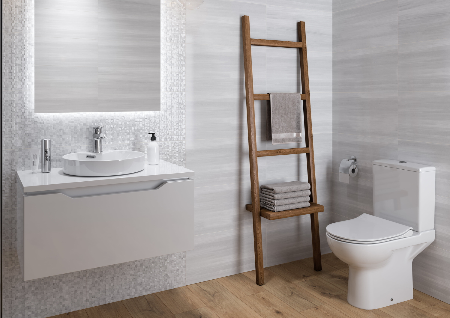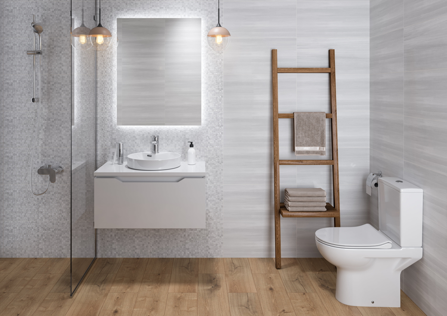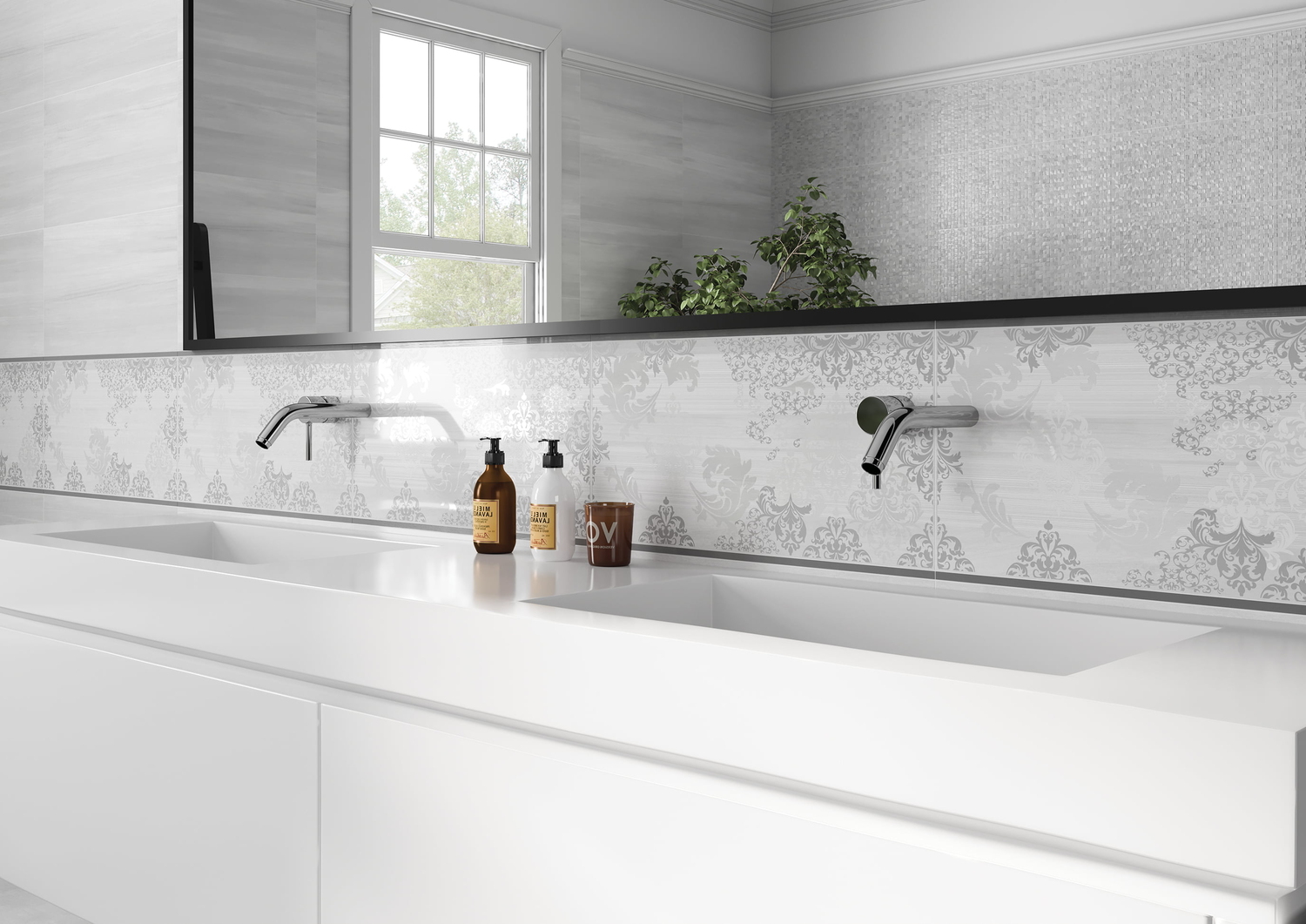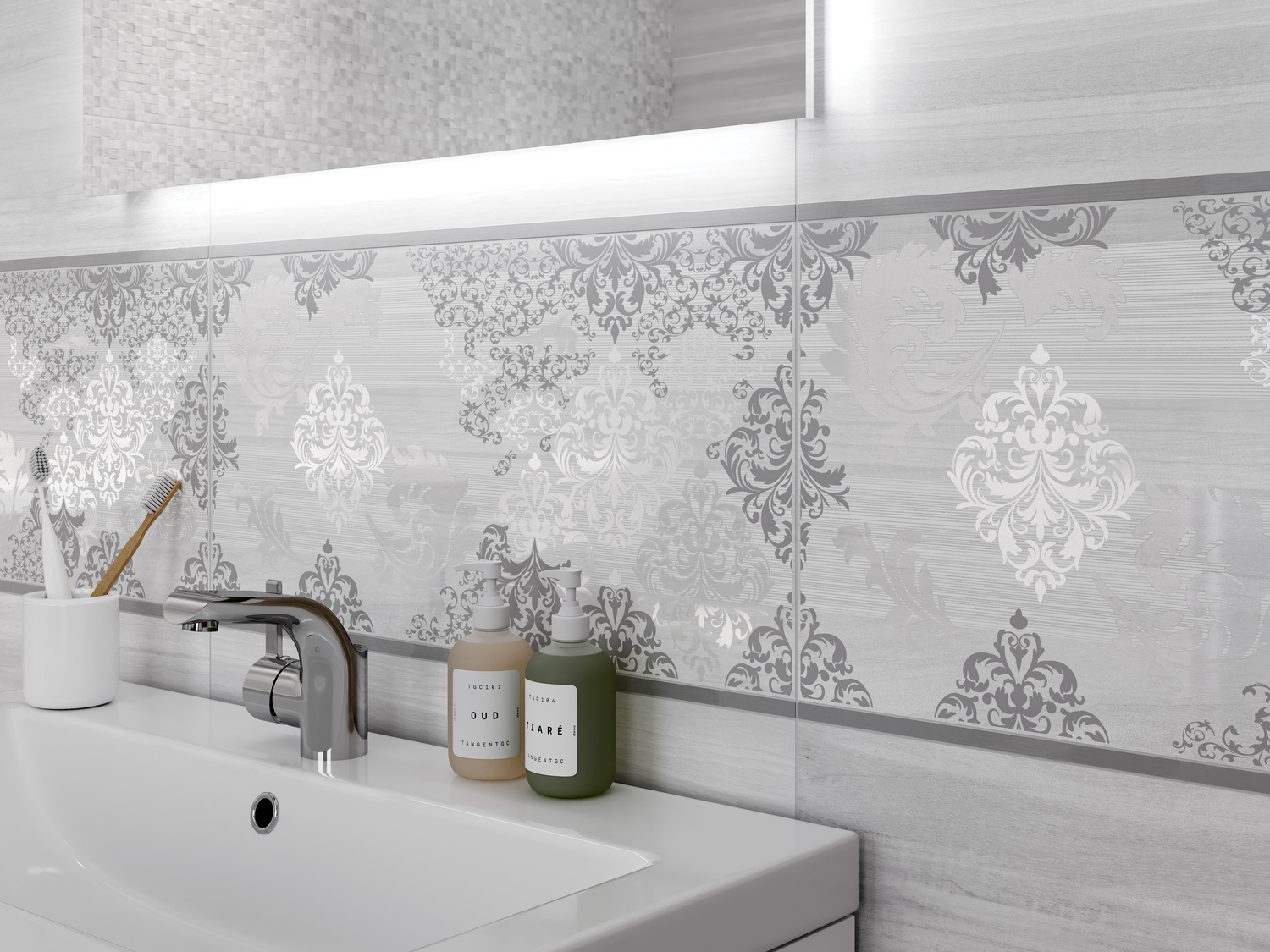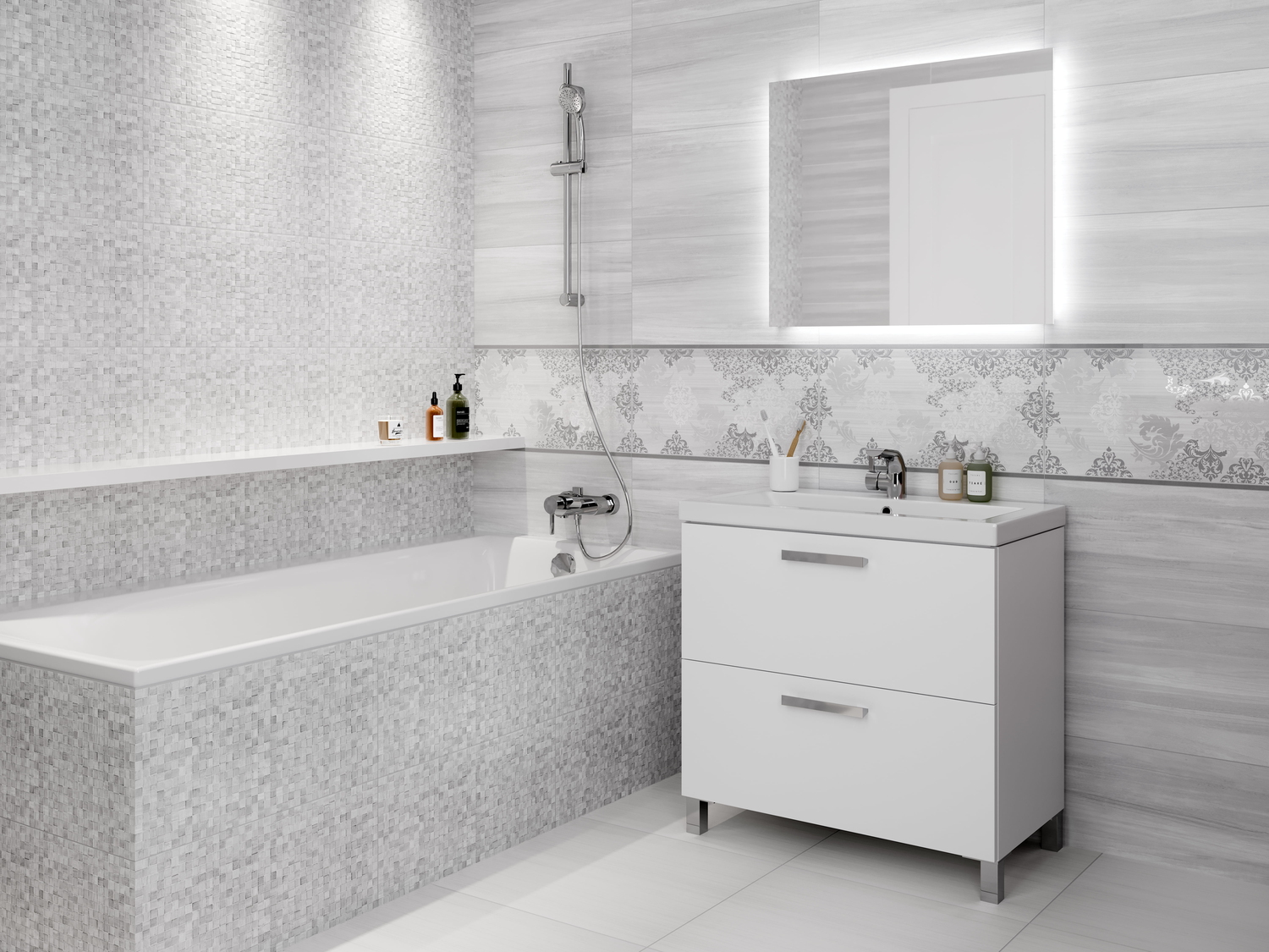 Мягкий серый цвет, один из самых модных трендов сезона, положен в основу палитры элегантной коллекции GREY SHADES. Коллекция демонстрирует всю глубину серого цвета и удивляет разнообразием его оттенков. Рельефная мелкая мозаика, соседствующая с базовой глянцевой плиткой светло-серого цвета, создаёт на стенах завораживающую игру бликов. Сердце коллекции — нежная вставка, украшенная классическим орнаментом «дамаск». Интерьер ванной идеально дополнит плитка из керамогранита с имитацией светлого цементного пола.