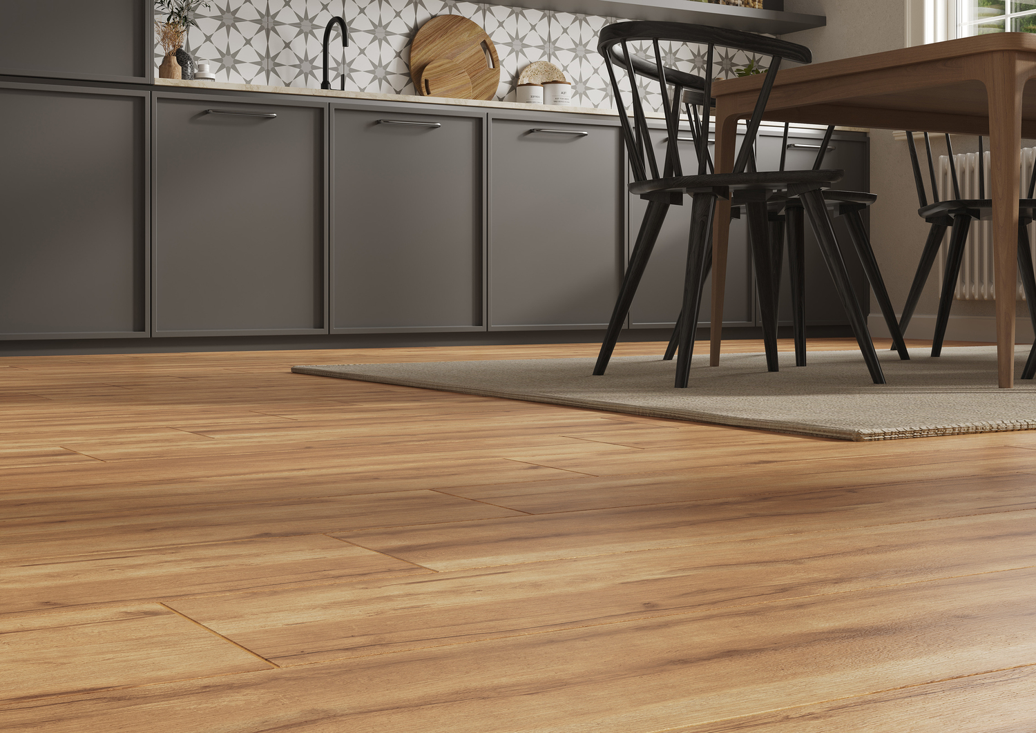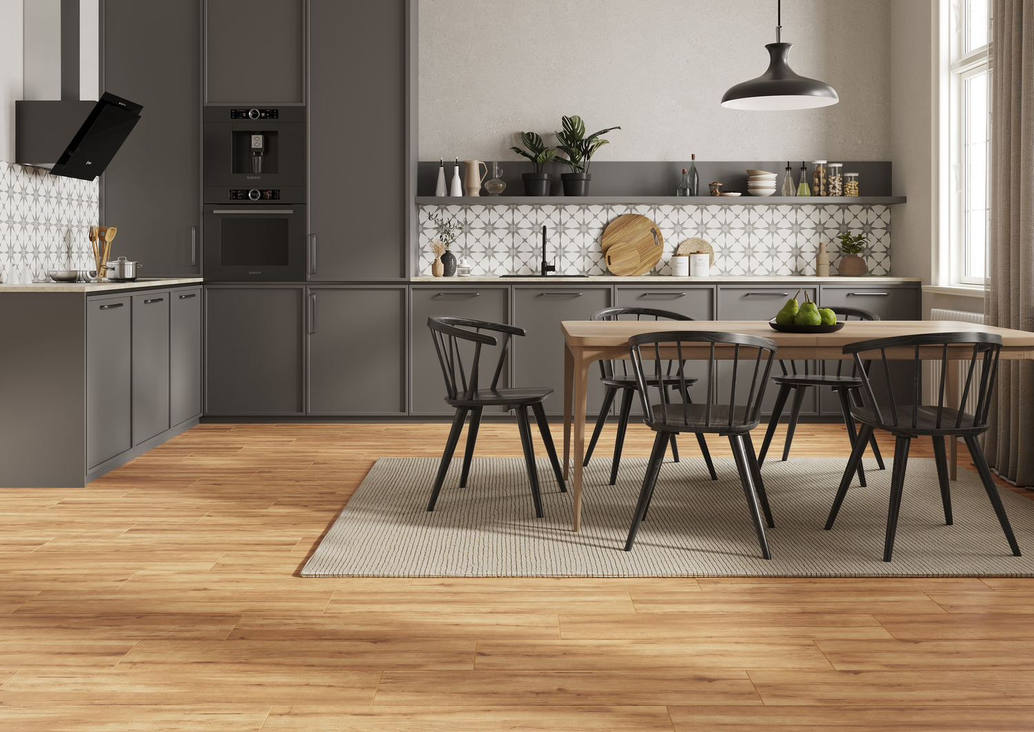 Тепло натурального дерева передает новинка керамогранита Interio. Реалистичный керамогранит с детально прорисованным рисунком древесного среза выполнен в формате доски 22х90 см. Его практически невозможно отличить от натуральной доски, особенно если материал используется с системой «тёплый пол».