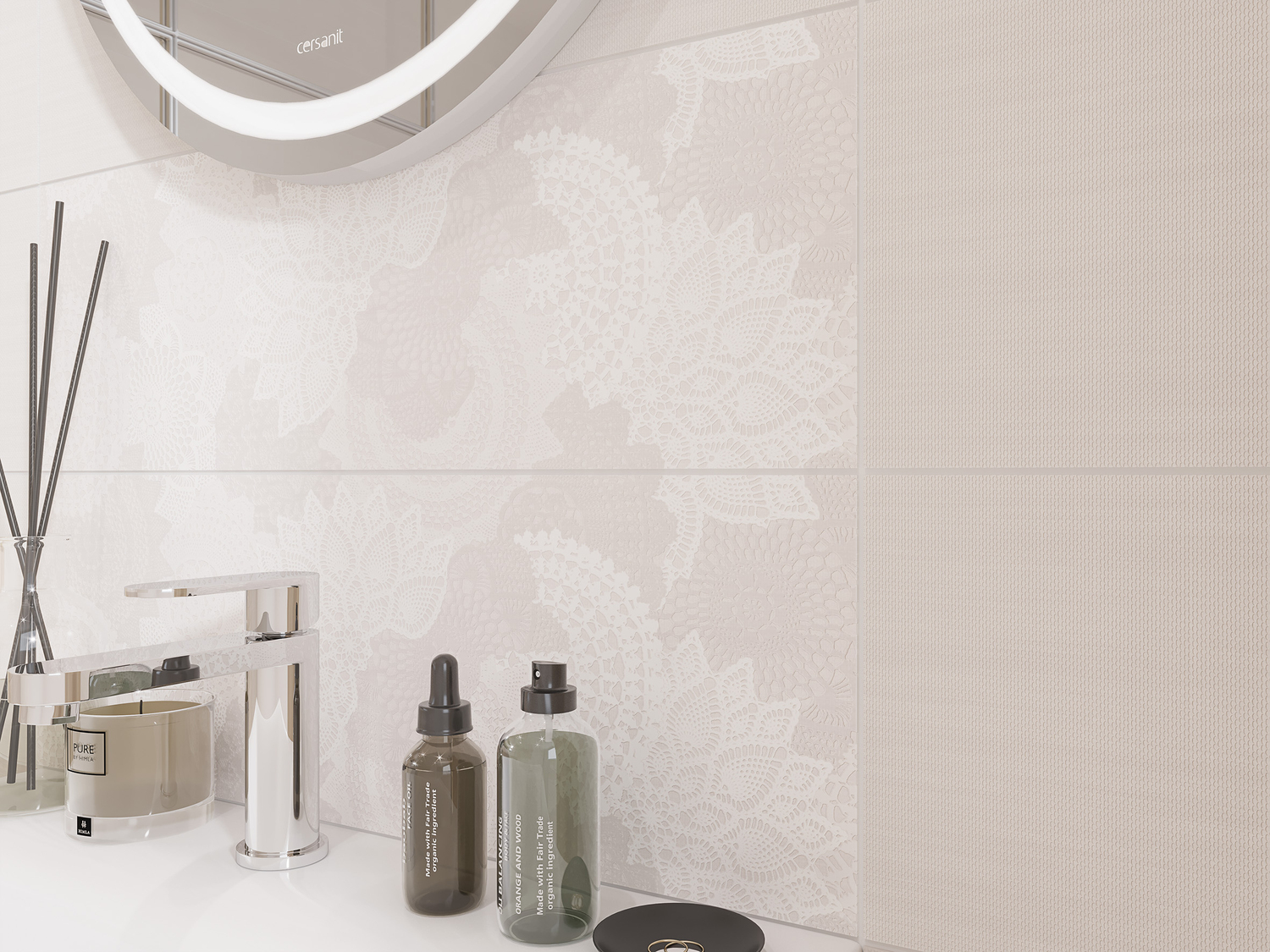 Утонченный и элегантный дизайн коллекции LIN (ЛИН) выполнен «под текстиль». Настенная плитка представлена в нескольких вариантах - с шестиугольниками и кружевами, созданными будто из мягких волокон и нитей. В каждом элементе ощущается приятное спокойствие и уют. Дополняет коллекцию красный бордюр для создания яркого акцента.