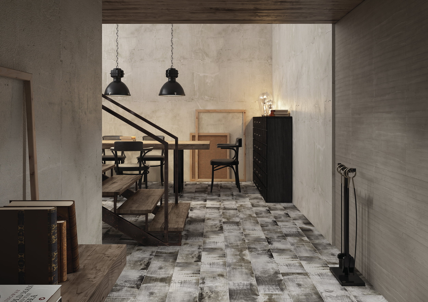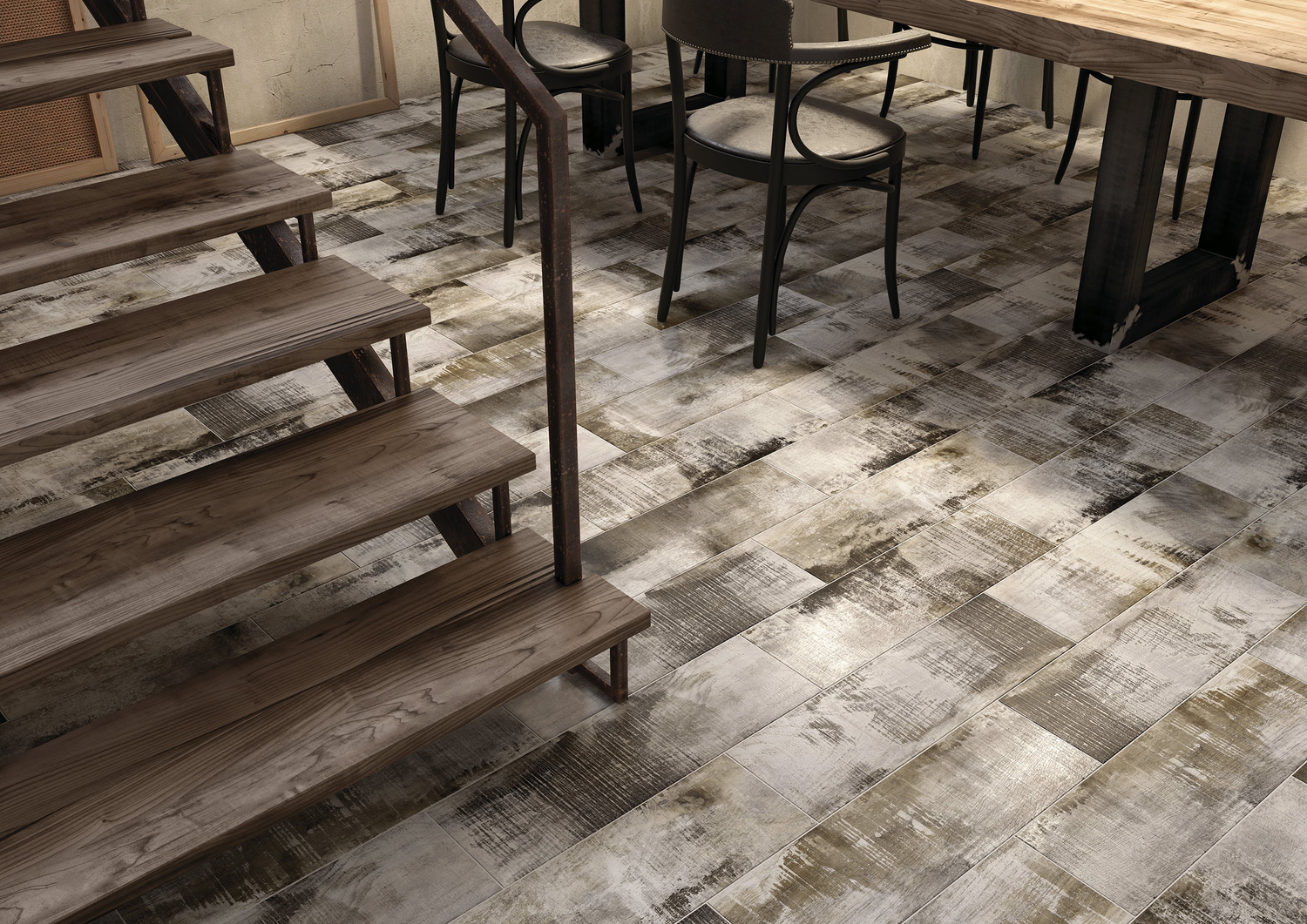 Состаренная окрашенная древесина, словно несущая отпечаток времени, стала основным мотивом коллекции напольного керамогранита SHABBYWOOD в стиле шебби-шик. Видимые следы времени, грубоватая текстура старого дерева и полустертые мазки белой краски на тёмно-сером фоне позволяют создавать уникальные визуальные образы. Дизайнеры предусмотрели достаточное количество вариаций рисунка плитки, чтобы покрытие создавало впечатление настоящего деревянного пола. Тёплый тон и антикварный внешний вид напольного покрытия будут хорошо сочетаться с винтажным интерьером в английском стиле.