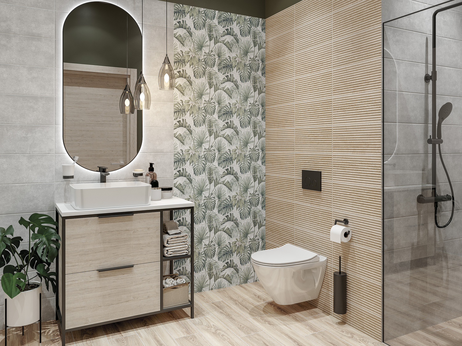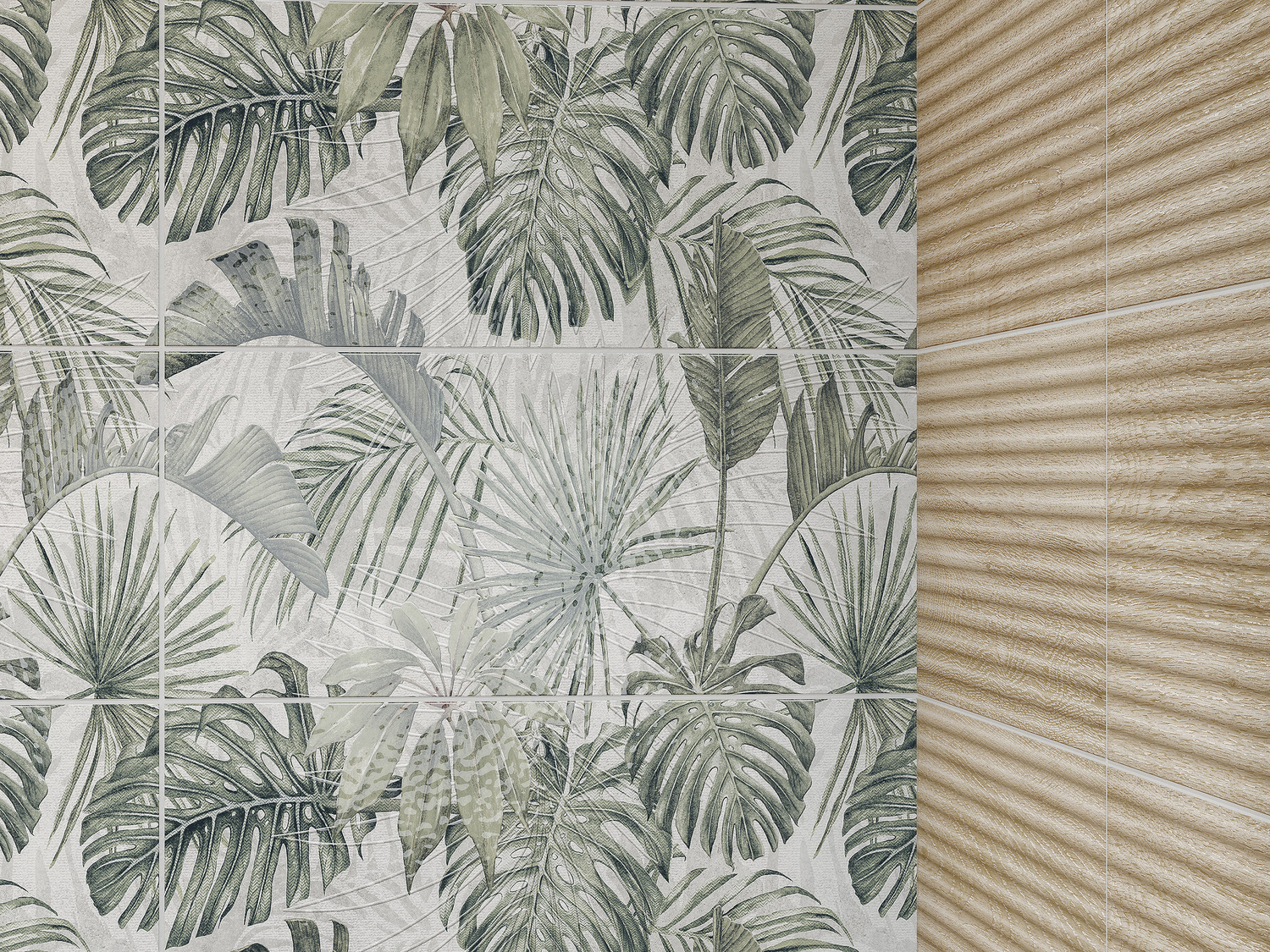 Естественная и динамичная коллекция настенной плитки Urbano создана для тех, кто ценит соприкосновение с природой, но любит жить в городе с его урбанистичной бетонной эстетикой. Плитка с плоской и рельефной поверхностью создаёт игру света и объёма в пространстве. Этот эффект поддерживает и блеск на поверхности декора — панно с растительной тематикой. На пол дизайнеры рекомендуют уложить «бетонные плиты» или «деревянные доски» керамогранита для завершения задумки.