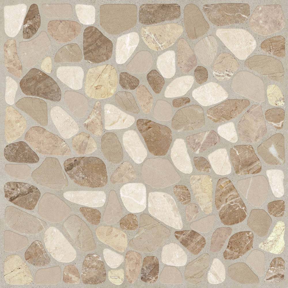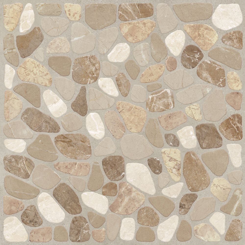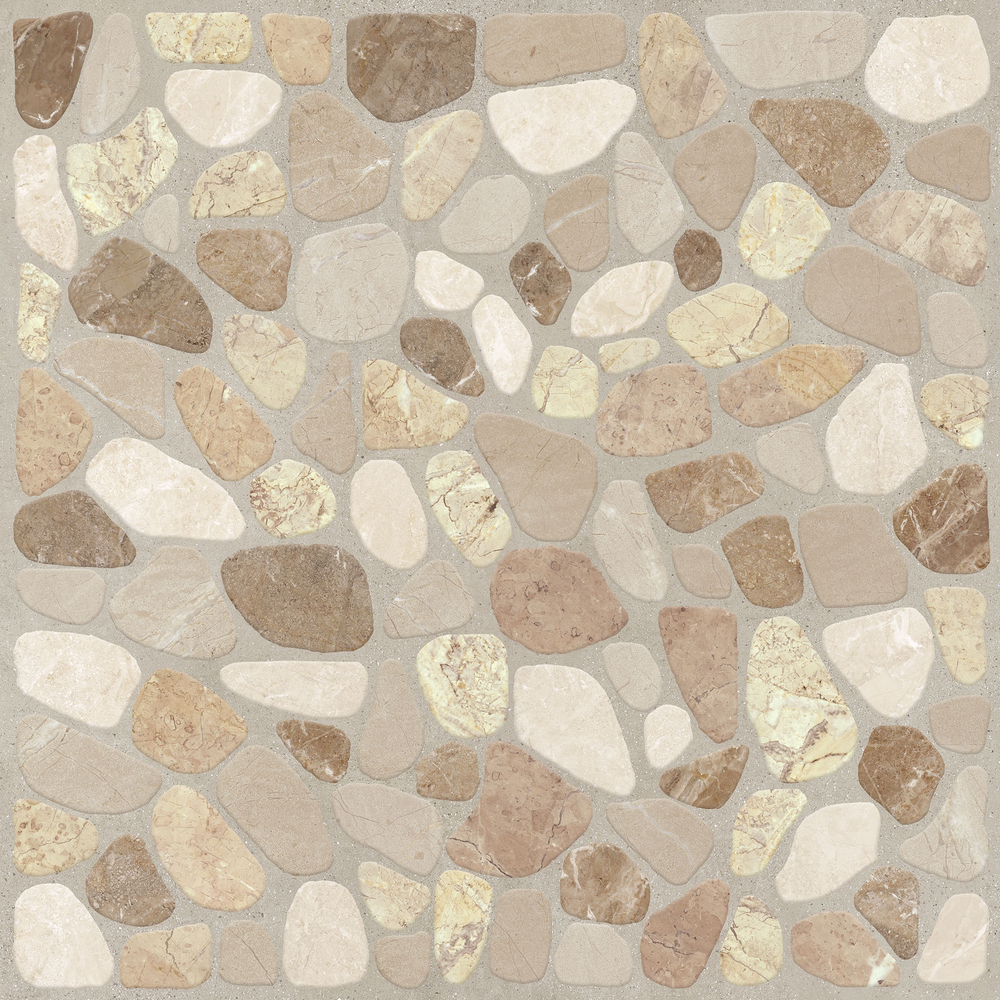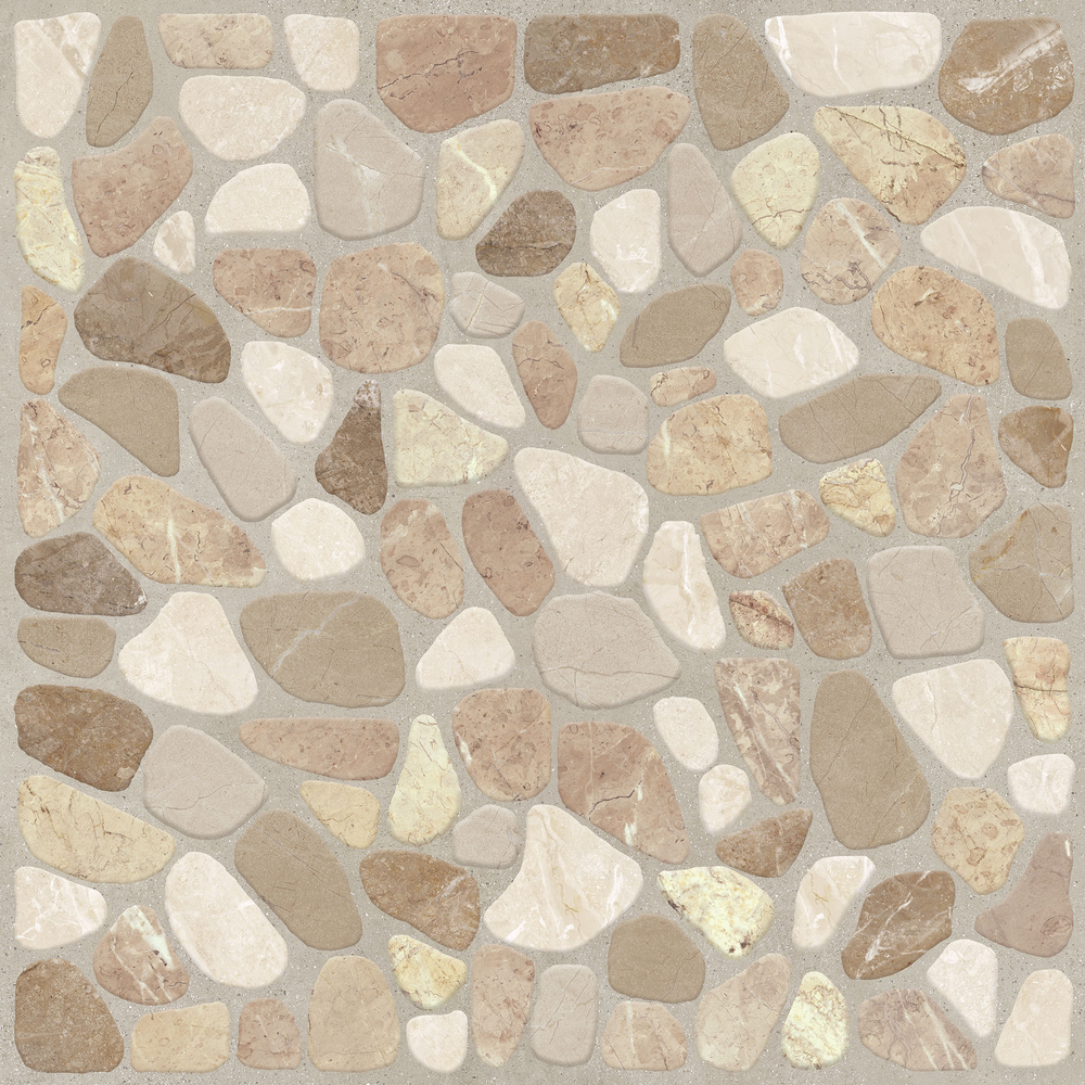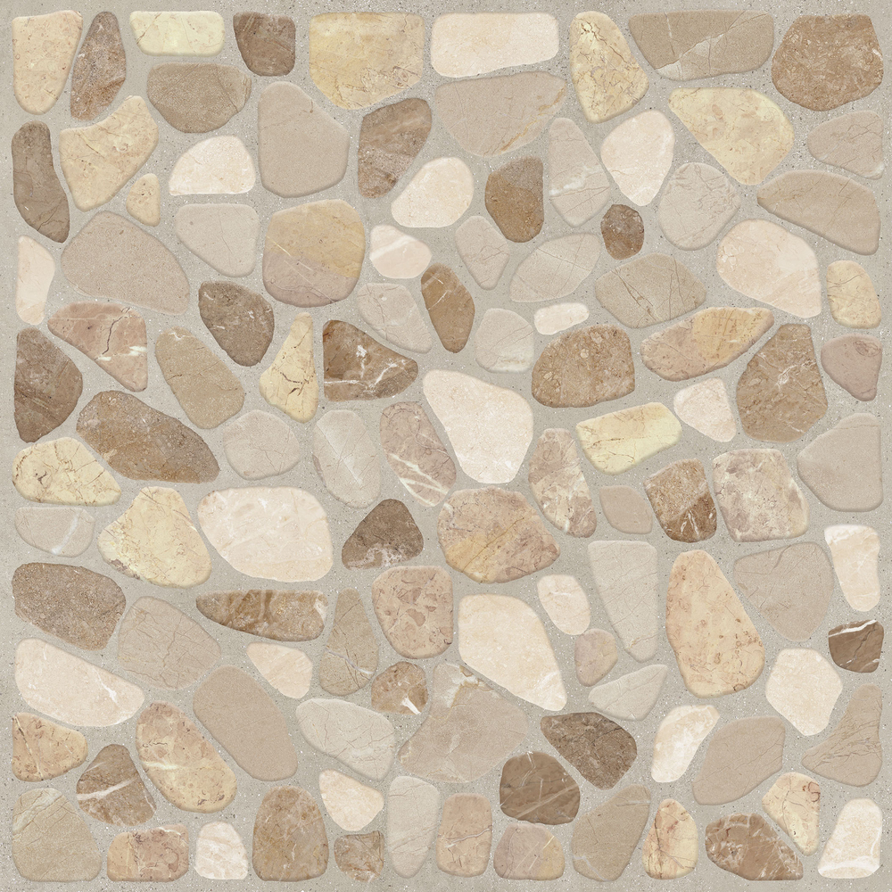 Керамогранита Capri — отделочный материал для интерьерной и экстерьерной отделки пола и стен. Рисунок материала имитирует выкладку камушков небольшого размера в бежевом оттенке.