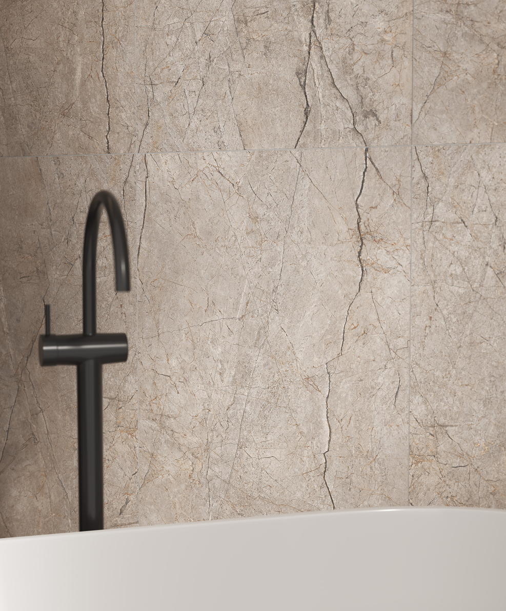 Матовая «каменная» поверхность керамогранита Silver Roots станет находкой для создания классических стильных интерьеров. Бронзовые прожилки на бежевом камне выглядят дорого, а благодаря высокоточной печати и карвинговому эффекту — очень натуралистично.