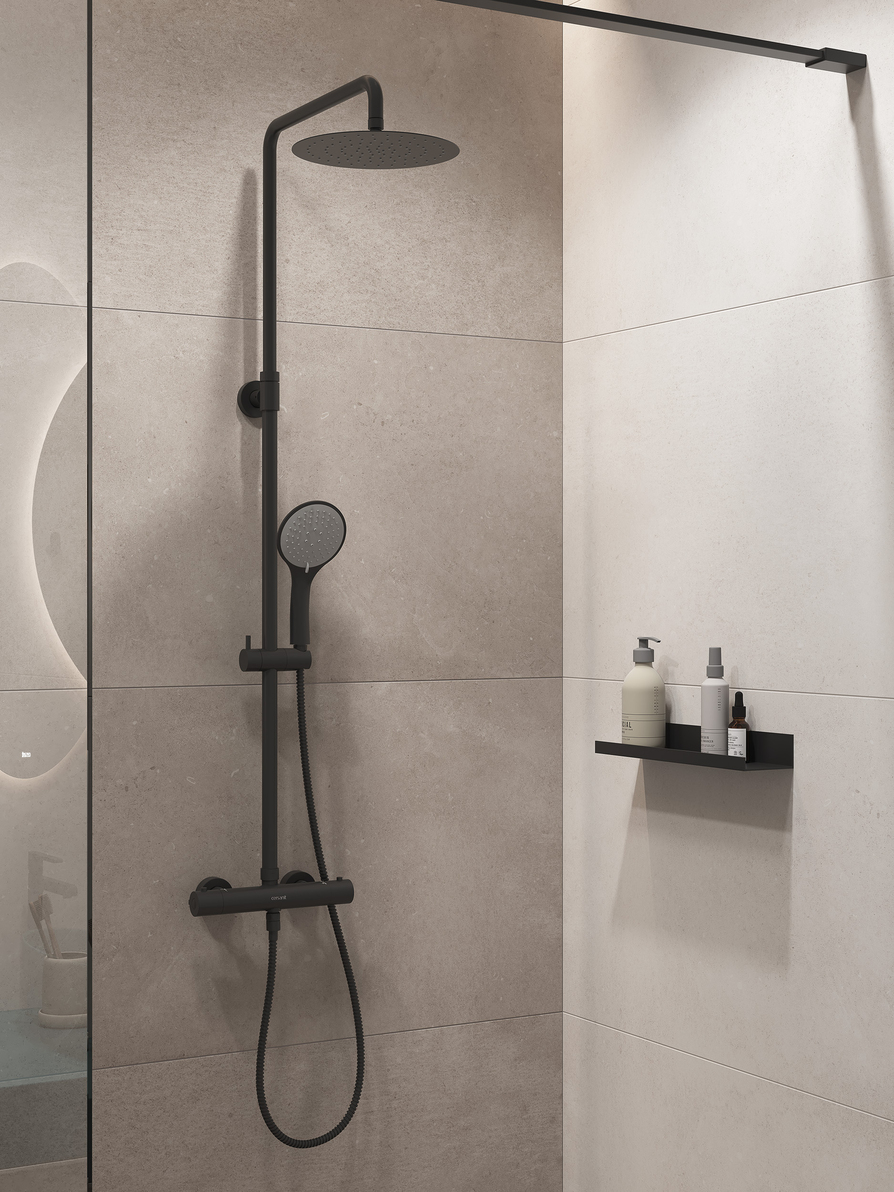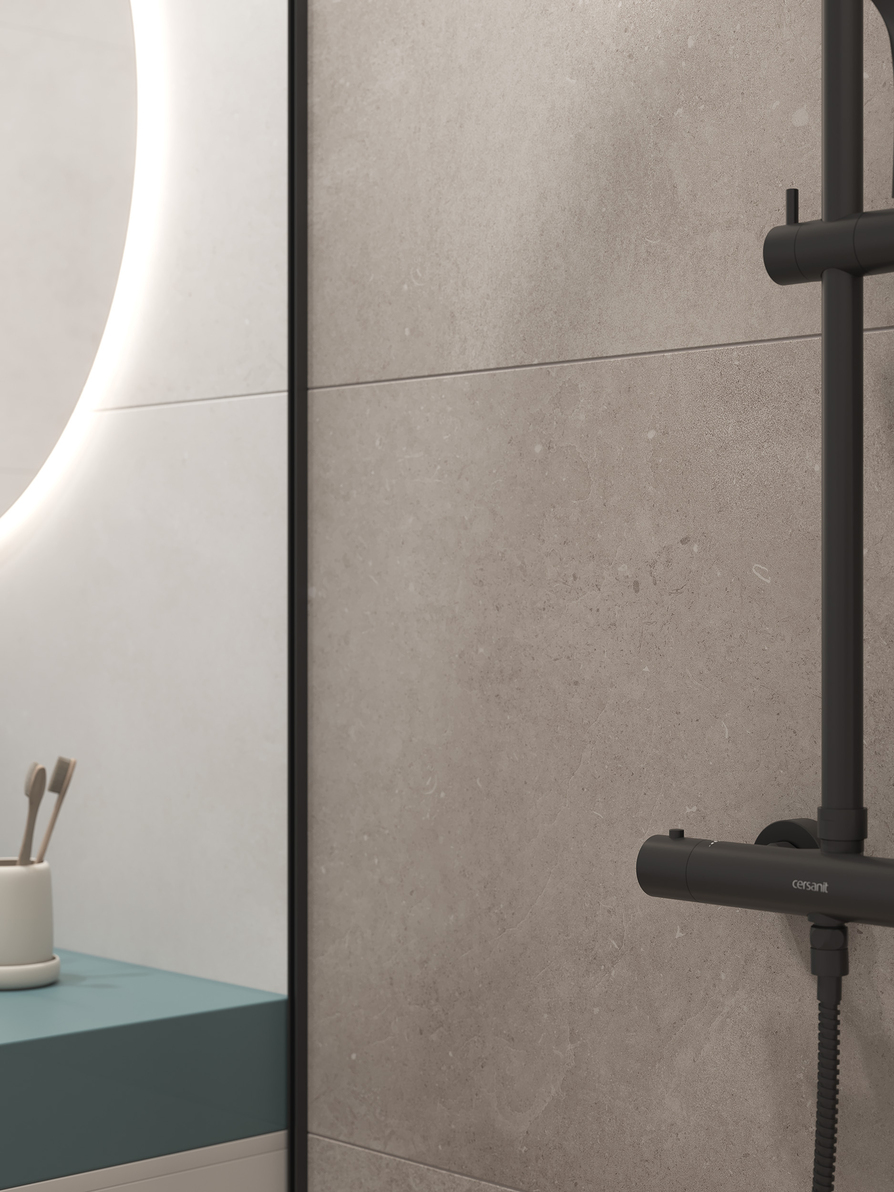 Приятный тёплый оттенок материала добавляет уюта пространству, а серый оттенок, позволяет стильно зонировать помещение. Материал украшен карвингом, благодаря чему эффектно искрится в лучах света. Его матовая поверхность приятна на ощупь и подойдет для отделки не только кухонь и ванных комнат, но и гостиных, обеденных и гостевых зон.
