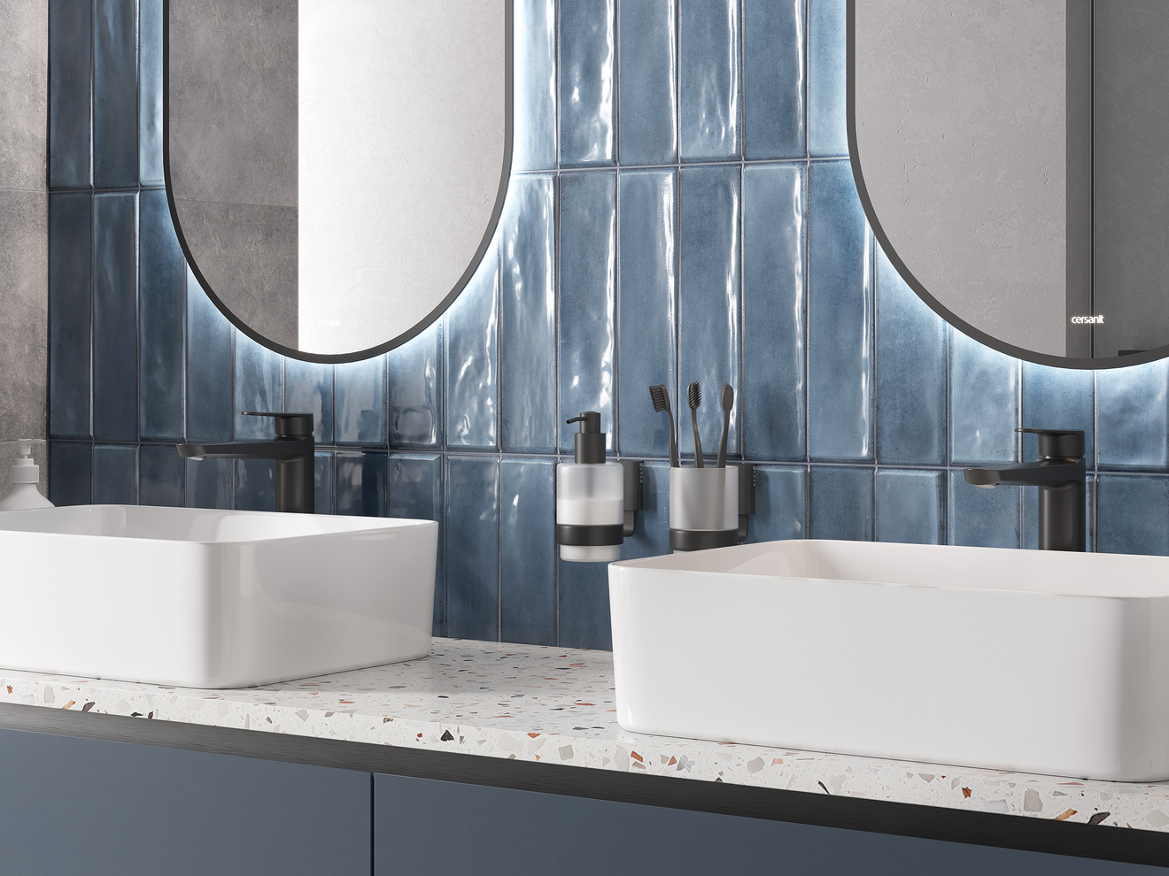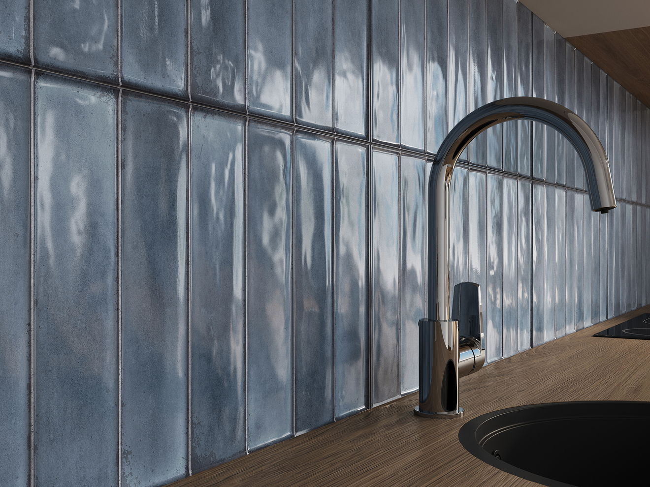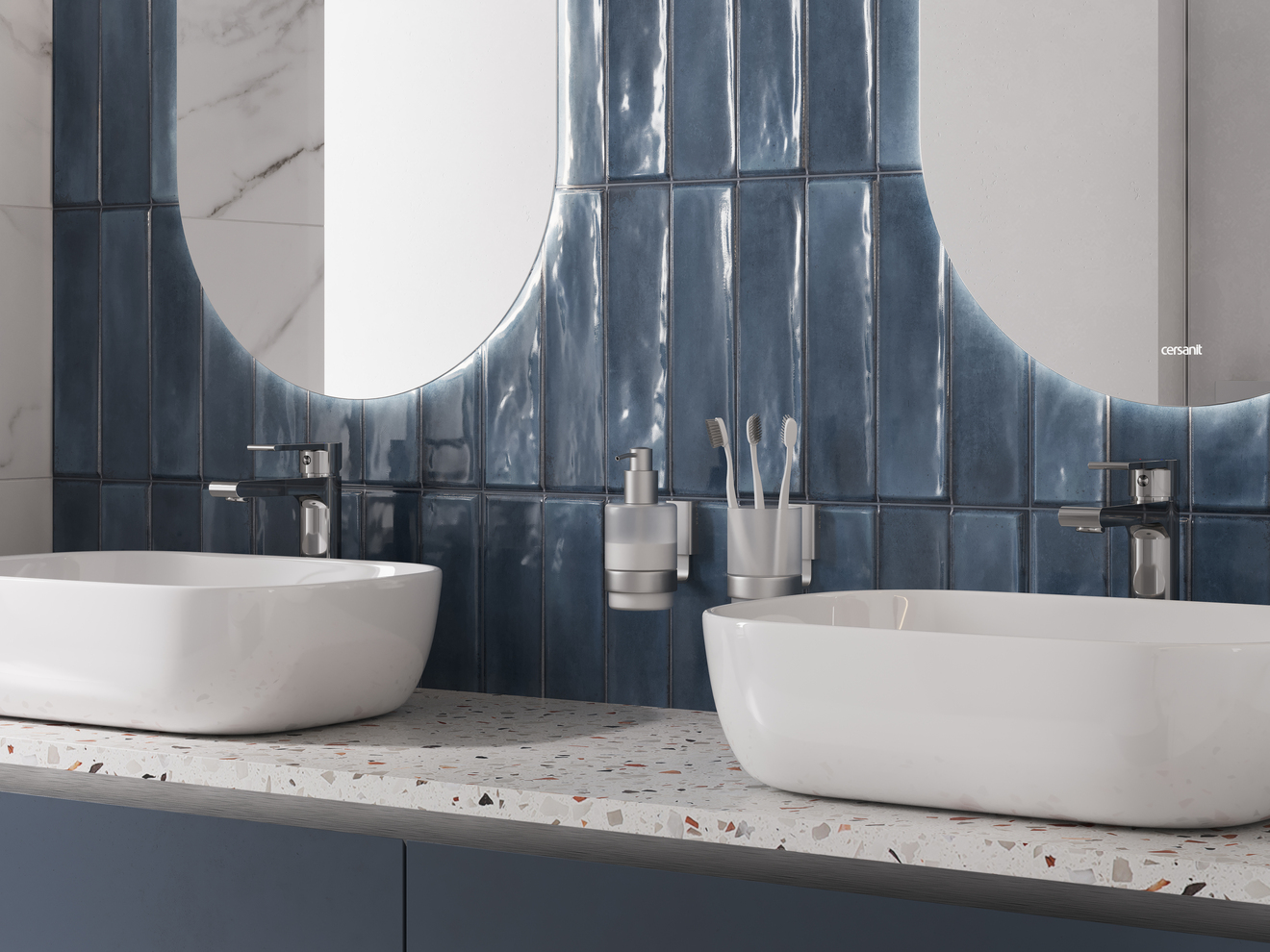 Дизайнерское решение капсулы Cascada — это плитка с глубоким рельефом — имитацией кабанчика и помятостями под хэндмейд. Эффектная текстура полностью сочетается с плиткой под цветной бетон и мрамор. Так, бетон в глубоком синем цвете контрастирует с серыми оттенками и белым мрамором, навевая воспоминания о морском прибое.