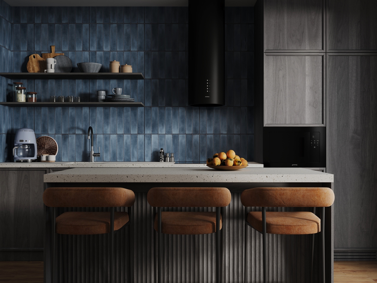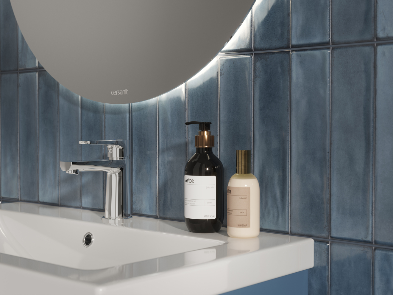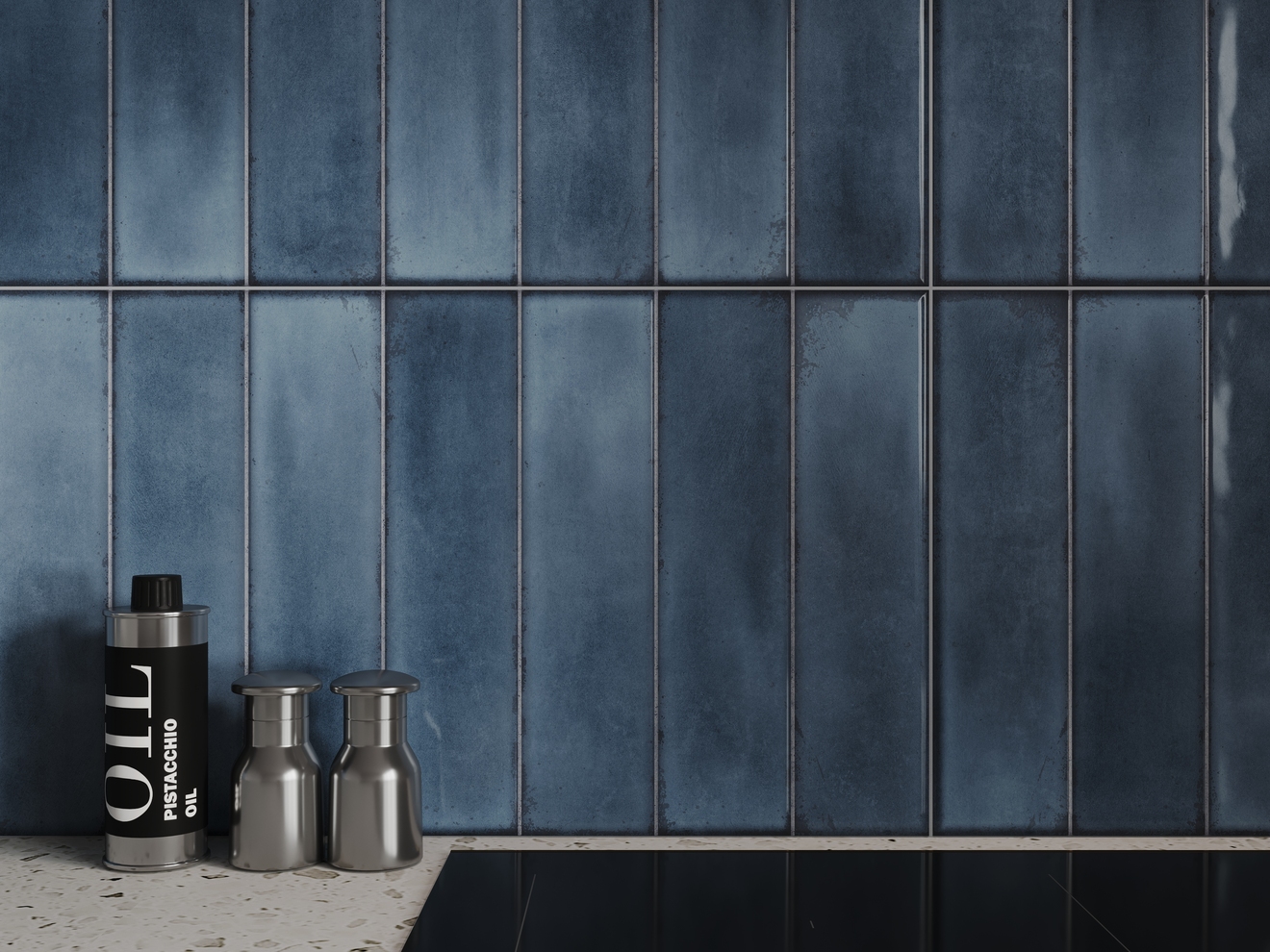 Дизайнерское решение капсулы Cascada — это плитка с глубоким рельефом — имитацией кабанчика и помятостями под хэндмейд. Эффектная текстура полностью сочетается с плиткой под цветной бетон и мрамор. Так, бетон в глубоком синем цвете контрастирует с серыми оттенками и белым мрамором, навевая воспоминания о морском прибое.