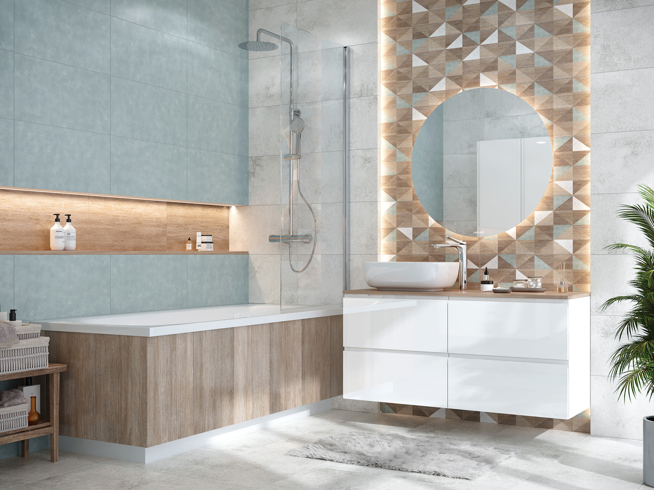Крашеный синий бетон имитирует коллекция синей настенной плитки Frosty. Это решение создает цветное настроение и помогает обыграть декоративный фон в подходящей цветовой гамме.