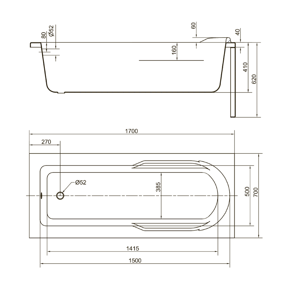 Прямоугольная ванна SANTANA 170 (чертеж)