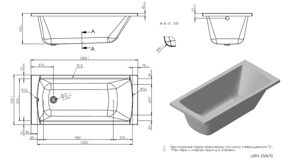 Ванна LARA 150*70 поставляется с каркасом. В комплект поставки входит чаша, гарантийный талон, инструкция по установке.