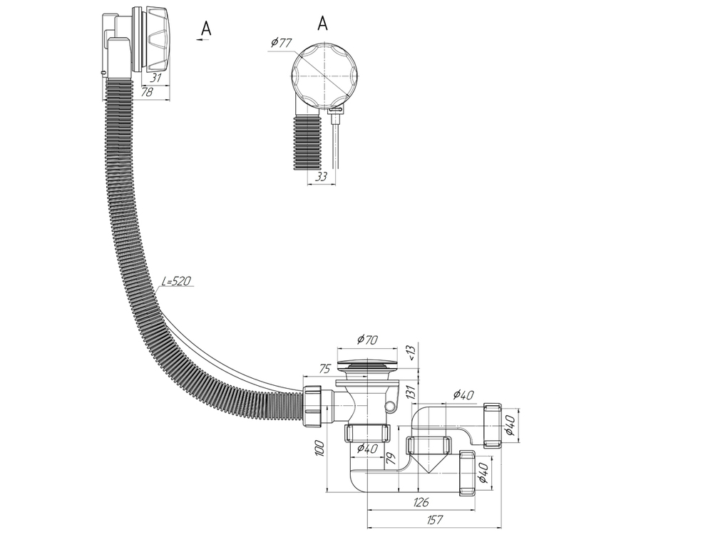 донный клапан полуавтоматический, слив-перелив, сифон П-образный с ревизионной гайкой