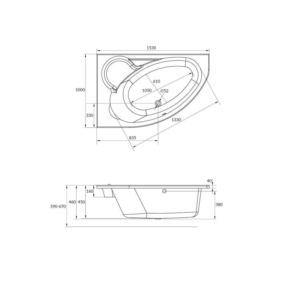 Ассиметричная ванна KALIOPE 153 правая (чертеж)
