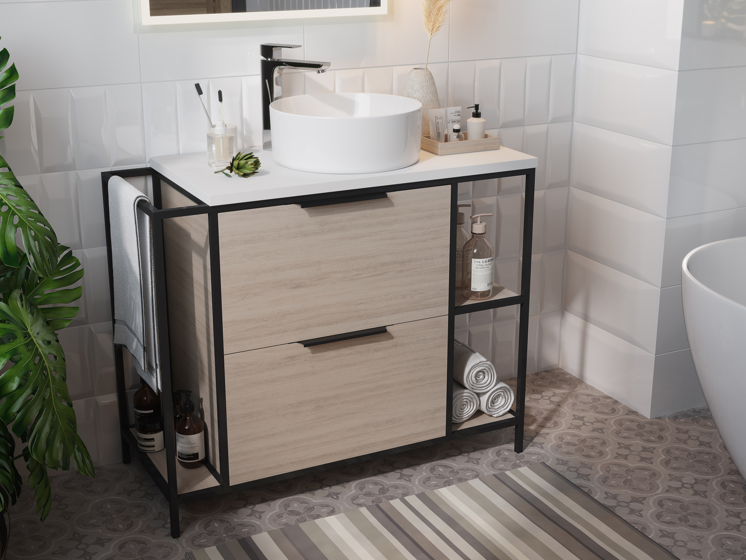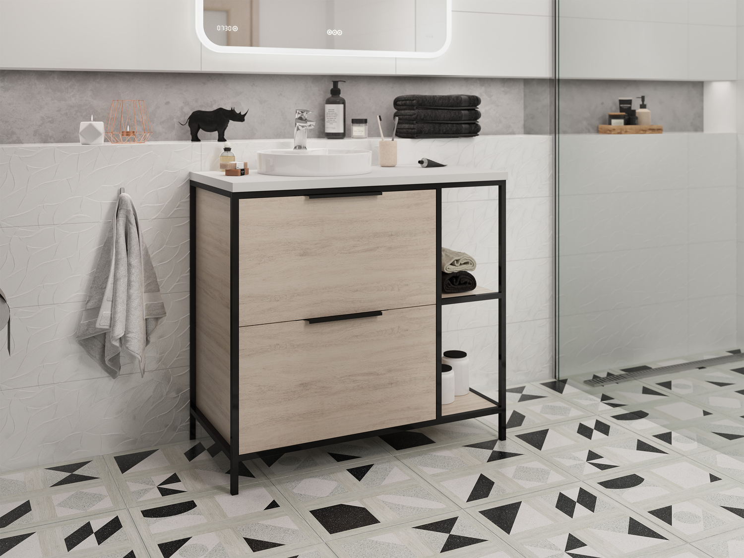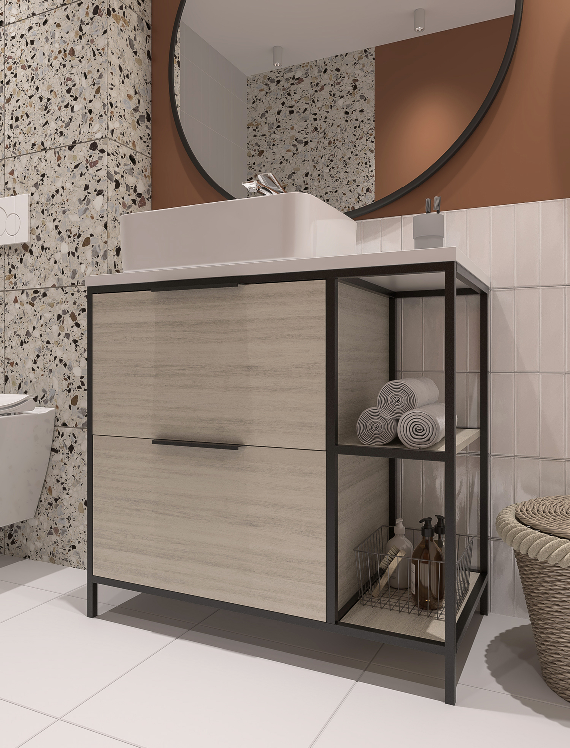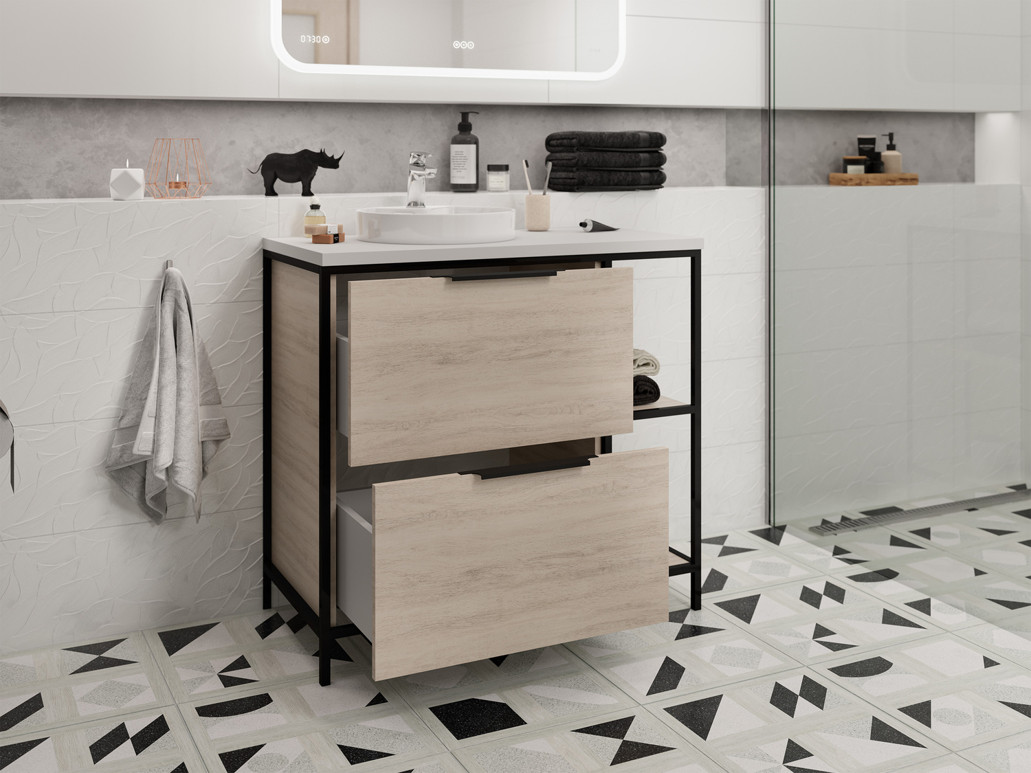 Тумба для раковины BOSQUET в двух вариантах (80 и 100 см) — это гармоничное сочетание реалистичной имитации дуба со стальным каркасом, выполненным в строгом чёрном цвете. Белая глянцевая столешница, изготовленная из МДФ-плиты, выглядит как стекло и служит основанием для белоснежных раковин Cersanit из коллекций CREA. Стильная контрастная композиция прекрасно подходит для помещений с повышенной влажностью и перепадами температур — все детали конструкции тщательно защищены от воздействия воды и пара.