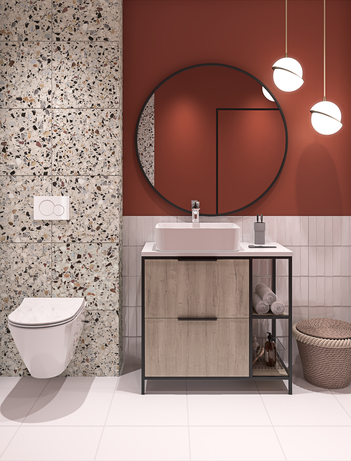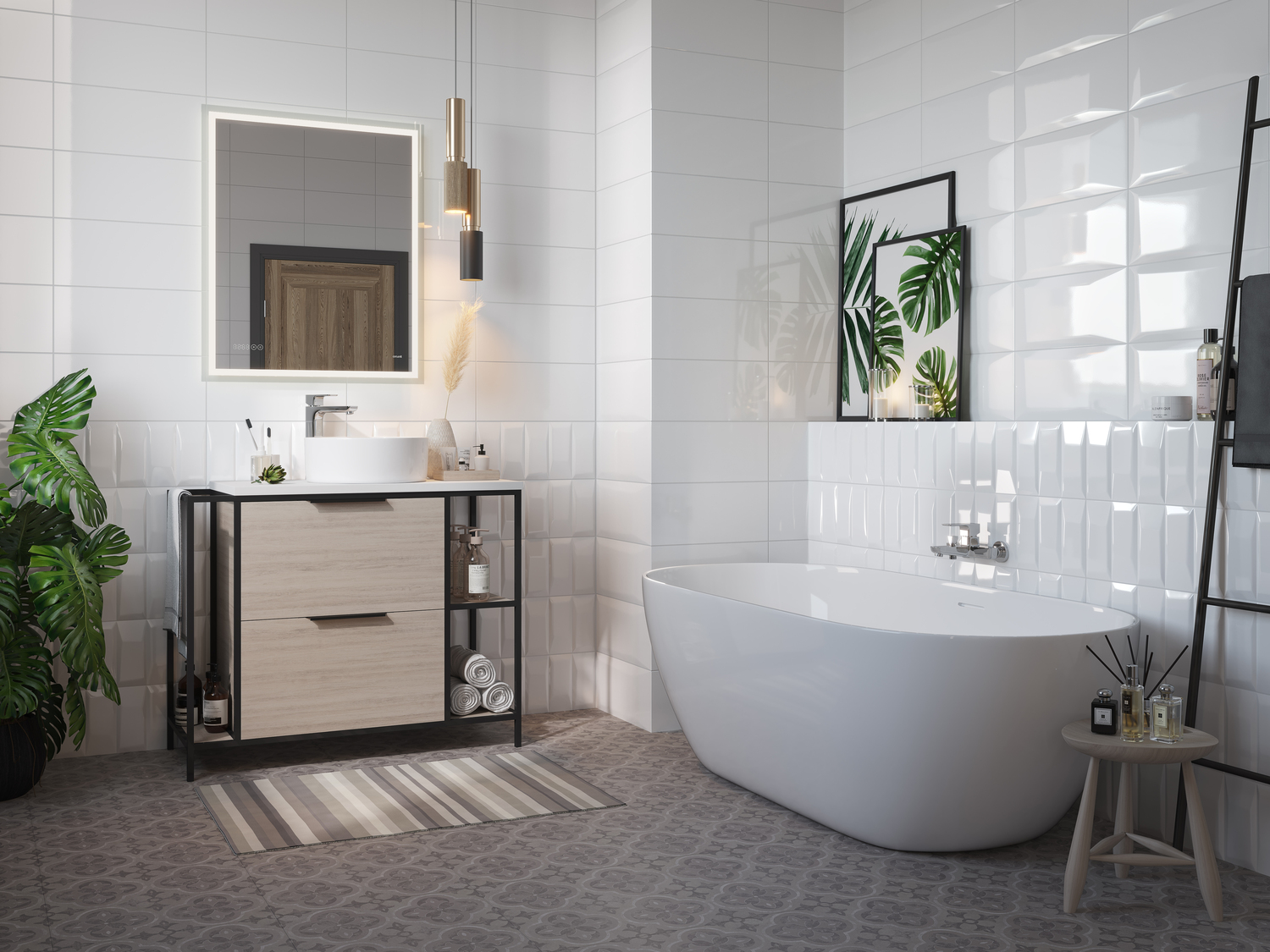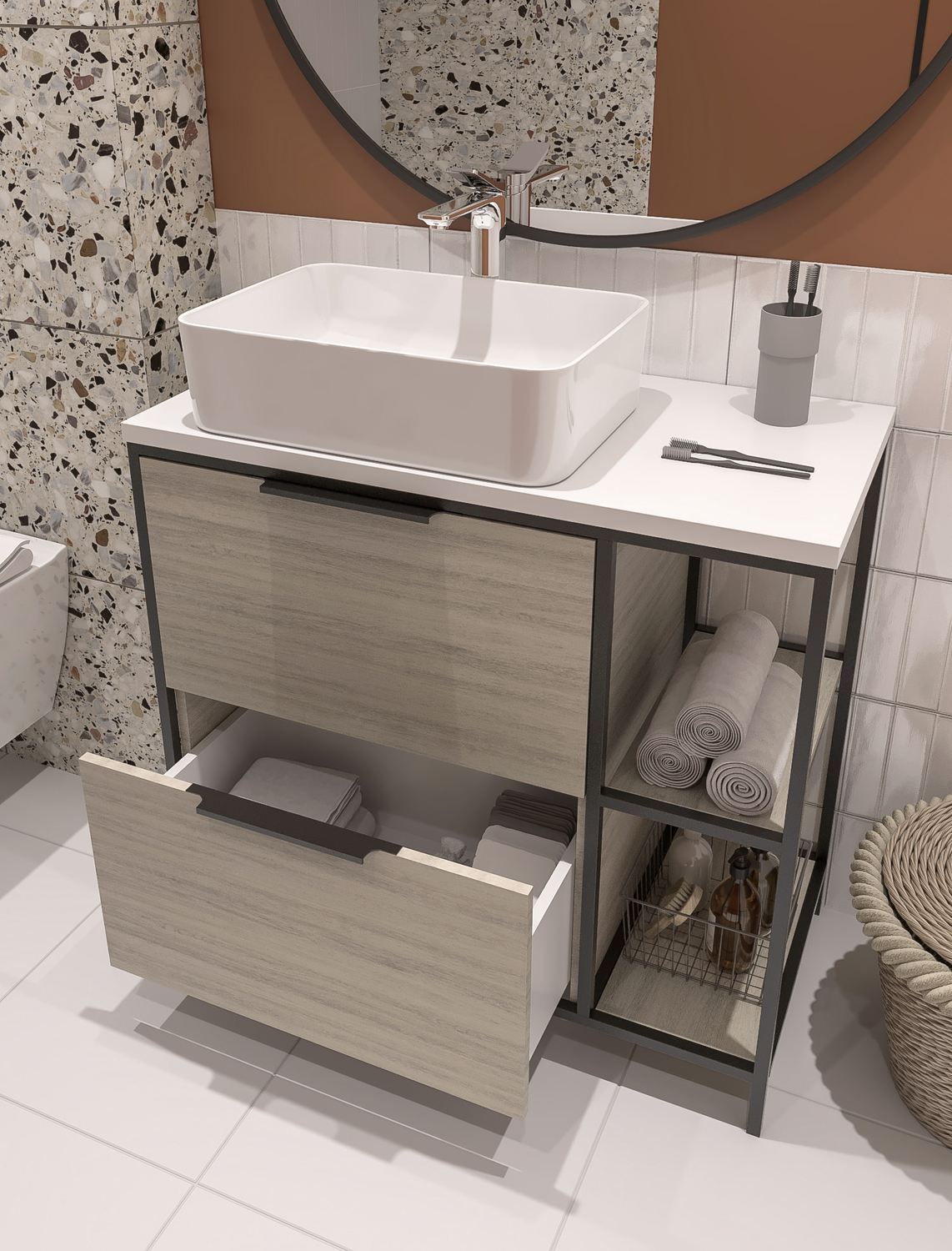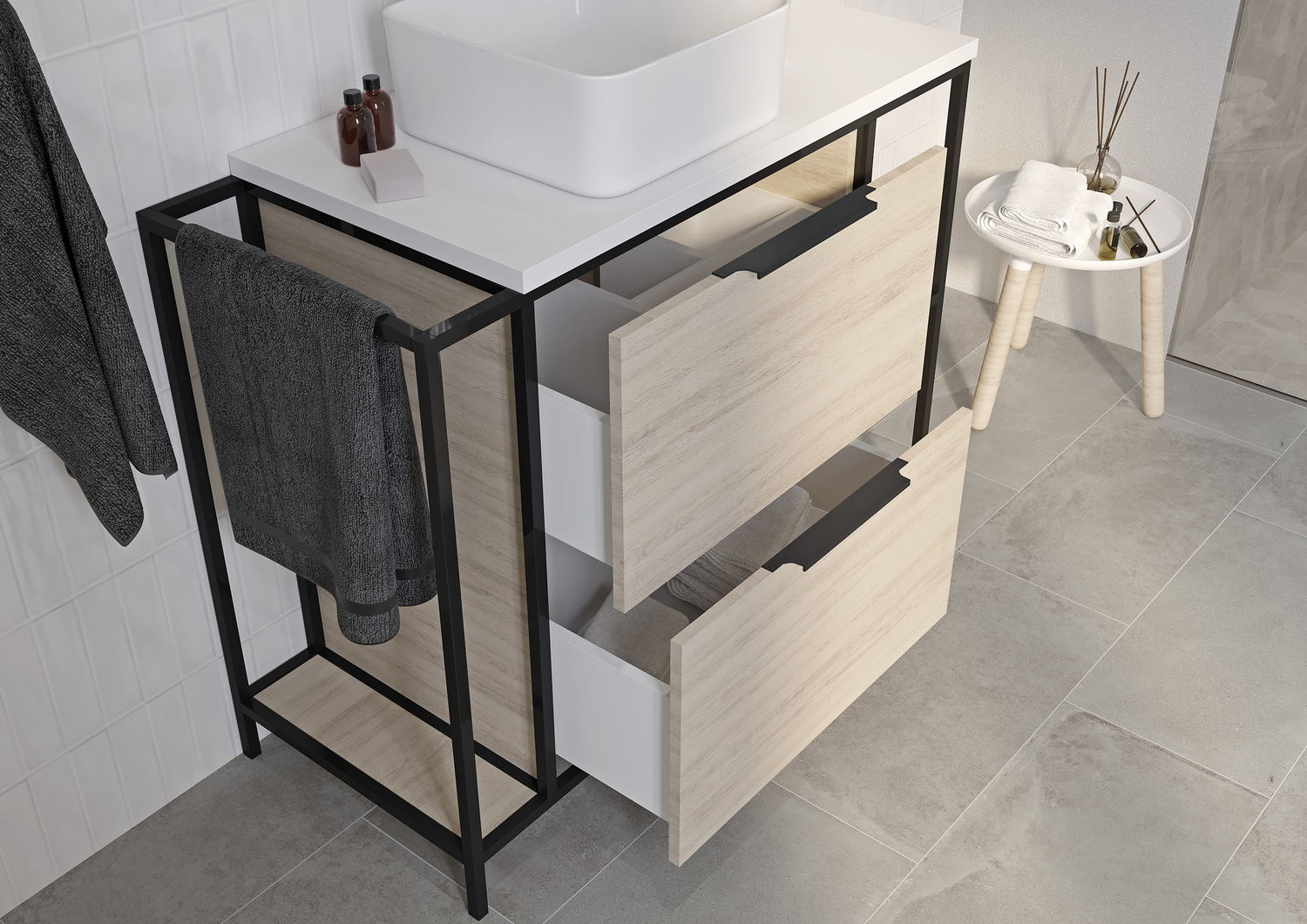 Тумба для раковины BOSQUET в двух вариантах (80 и 100 см) — это гармоничное сочетание реалистичной имитации дуба со стальным каркасом, выполненным в строгом чёрном цвете. Белая глянцевая столешница, изготовленная из МДФ-плиты, выглядит как стекло и служит основанием для белоснежных раковин Cersanit из коллекций CREA. Стильная контрастная композиция прекрасно подходит для помещений с повышенной влажностью и перепадами температур — все детали конструкции тщательно защищены от воздействия воды и пара.