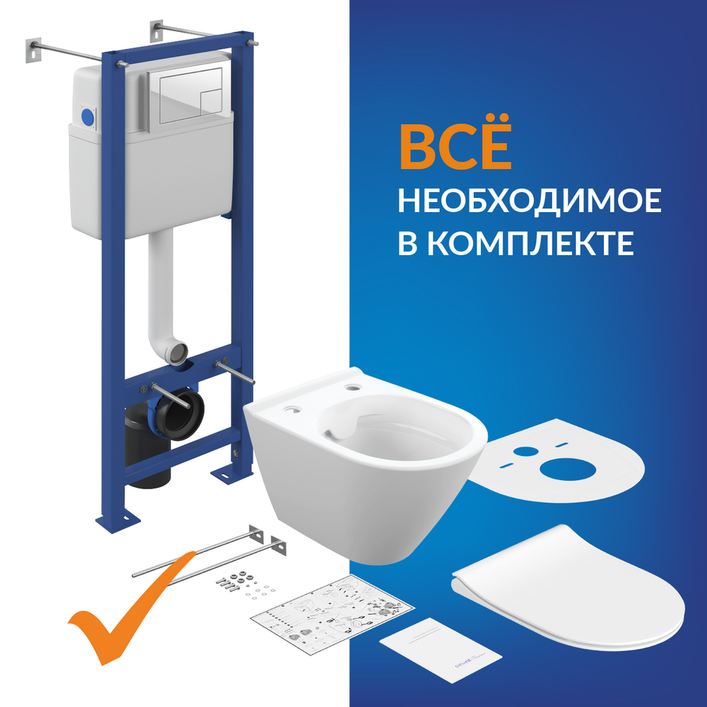 подвесной унитаз, крышка-сиденье, инсталляция, кнопка смыва, шумоизоляционная прокладка, монтажный комплект, гарантийный талон/инструкция