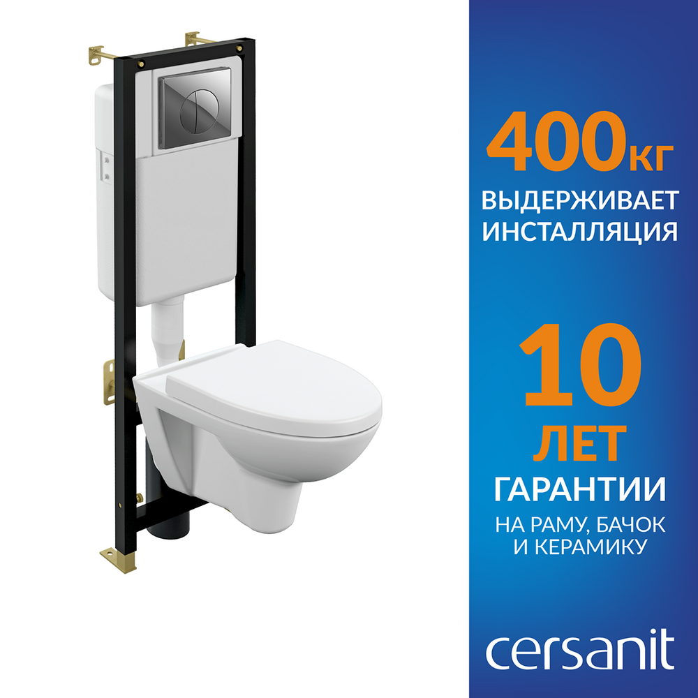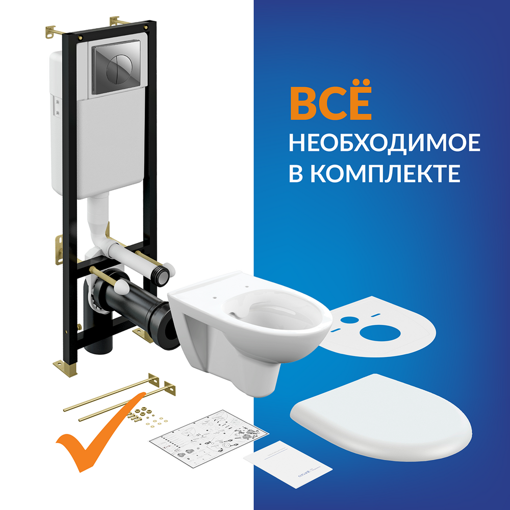 подвесной унитаз, крышка-сиденье, инсталляция, кнопка смыва, шумоизоляционная прокладка, монтажный комплект, гарантийный талон/инструкция