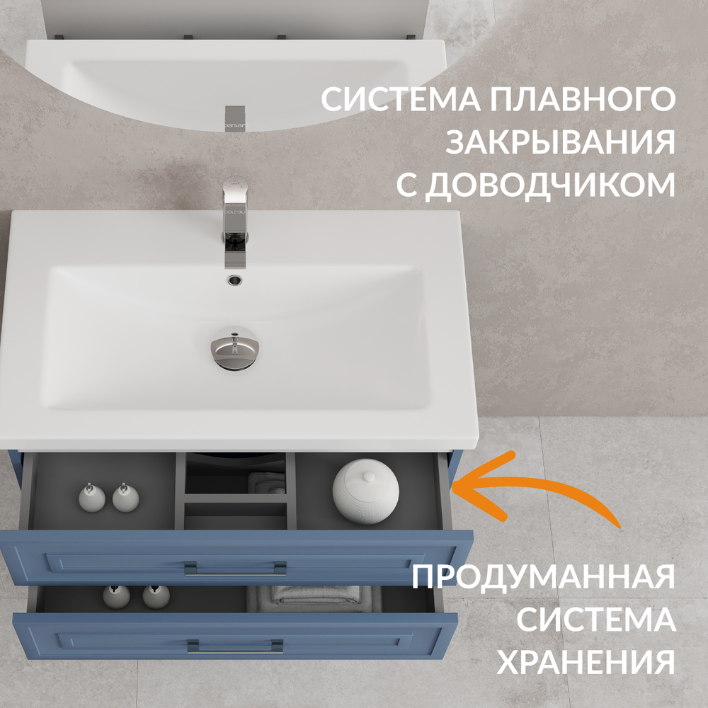 Тумба выполнена в актуальном нежно-голубом цвете, который поможет создать нужное настроение в ванной комнате. Матовый оттенок голубого особенно хорошо смотрится в сочетании с пастельными тонами, светлым деревом или металлическими элементами.
