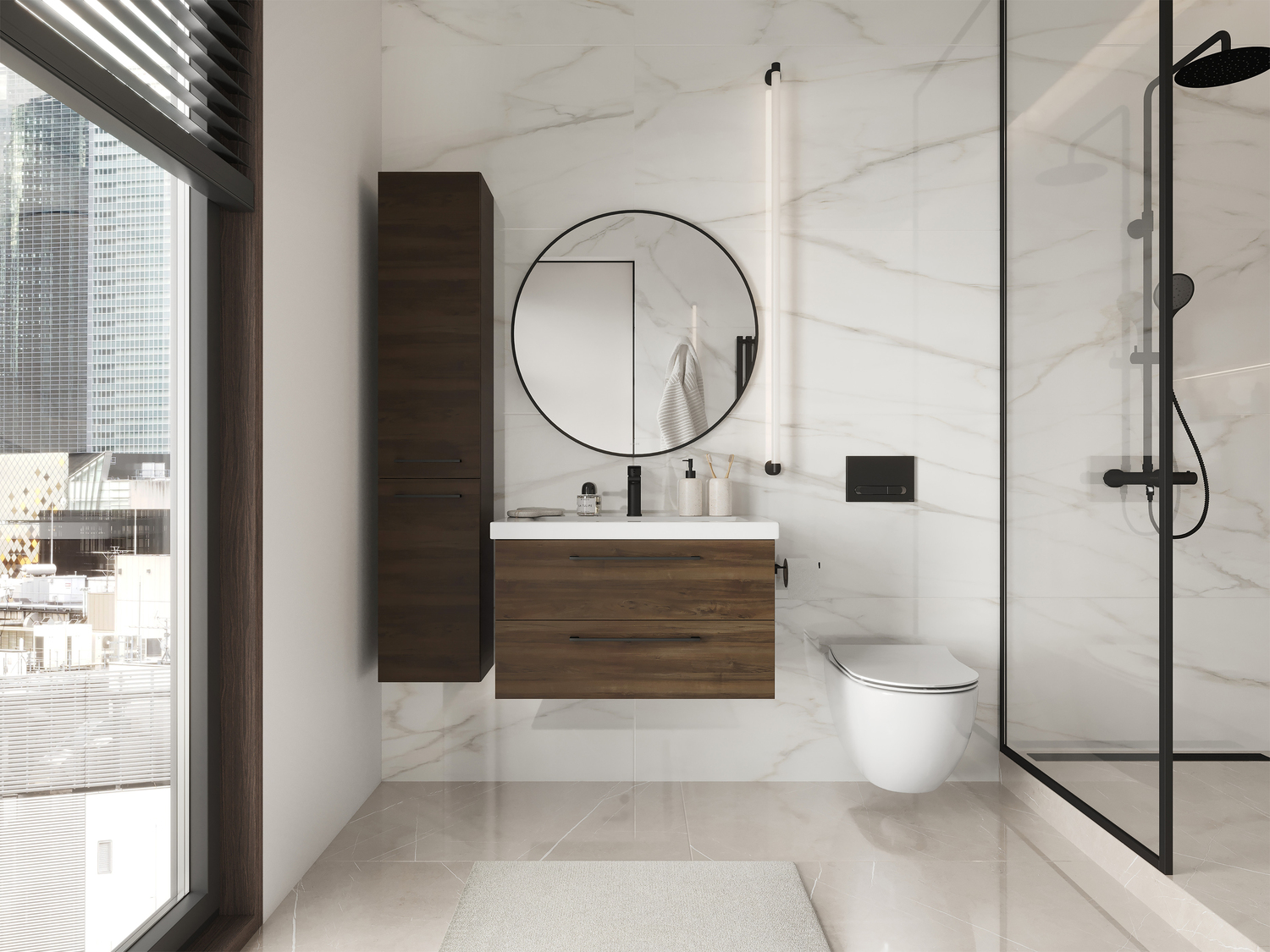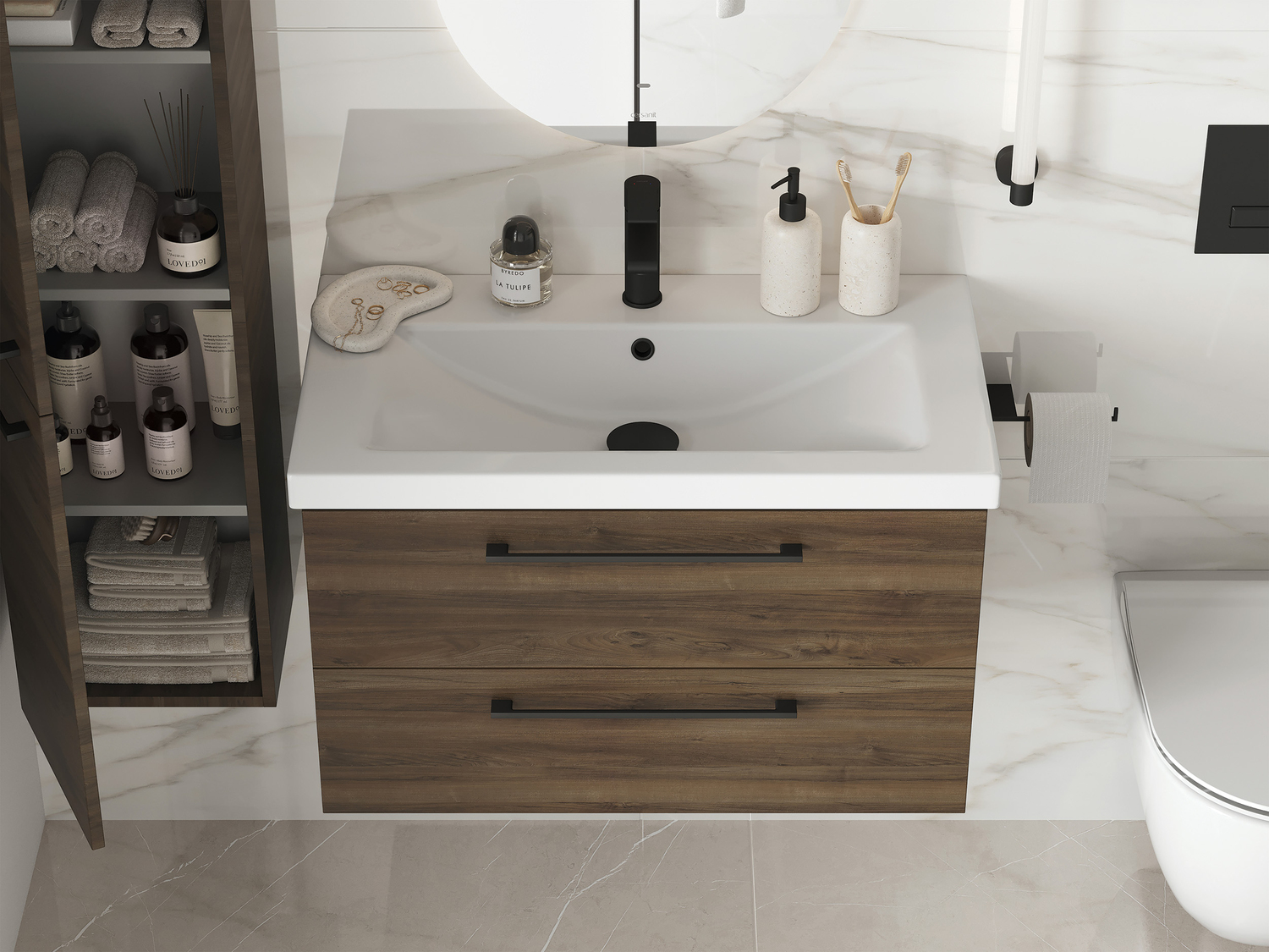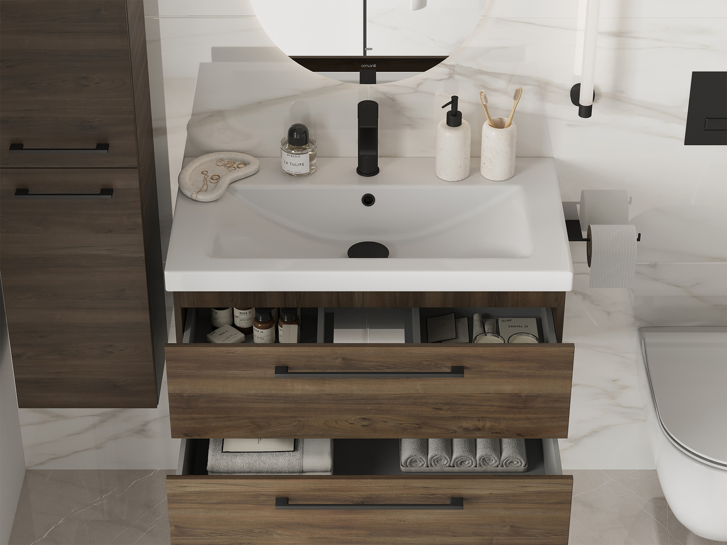 Тумба под раковину Lara Табак — это изысканное сочетание благородной красоты цвета тёмного дерева с минималистичным дизайном. Она наполнит шармом всю Вашу ванную комнату. Мебель представлена в актуальных размерах, дополнена эргономичным пеналом и сочетается со всей продукцией бренда Cersanit.