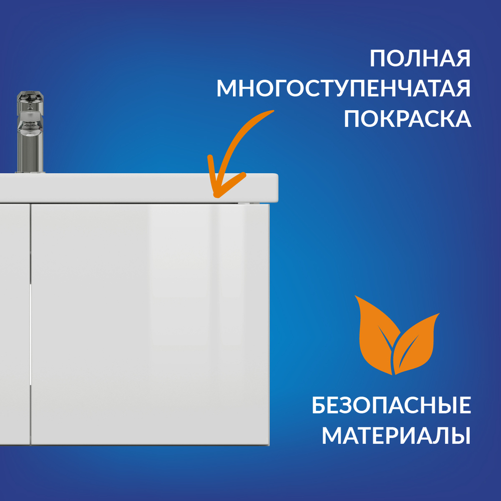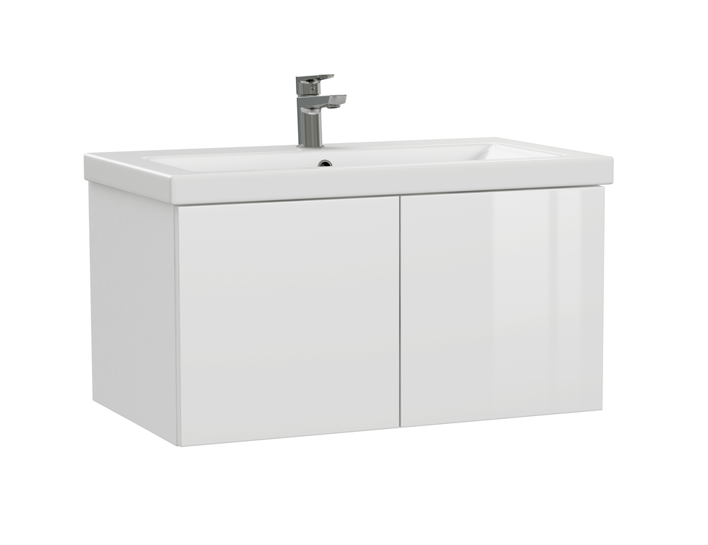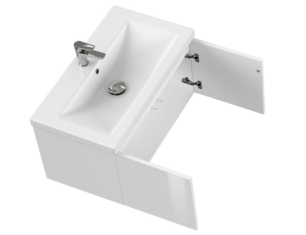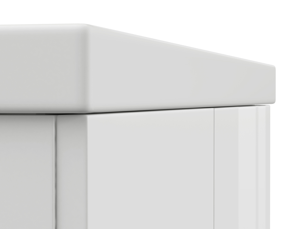 Белые глянцевые фасады, четкие геометрические формы тумбы помогут создать минималистичный и строгий интерьер ванной комнаты.