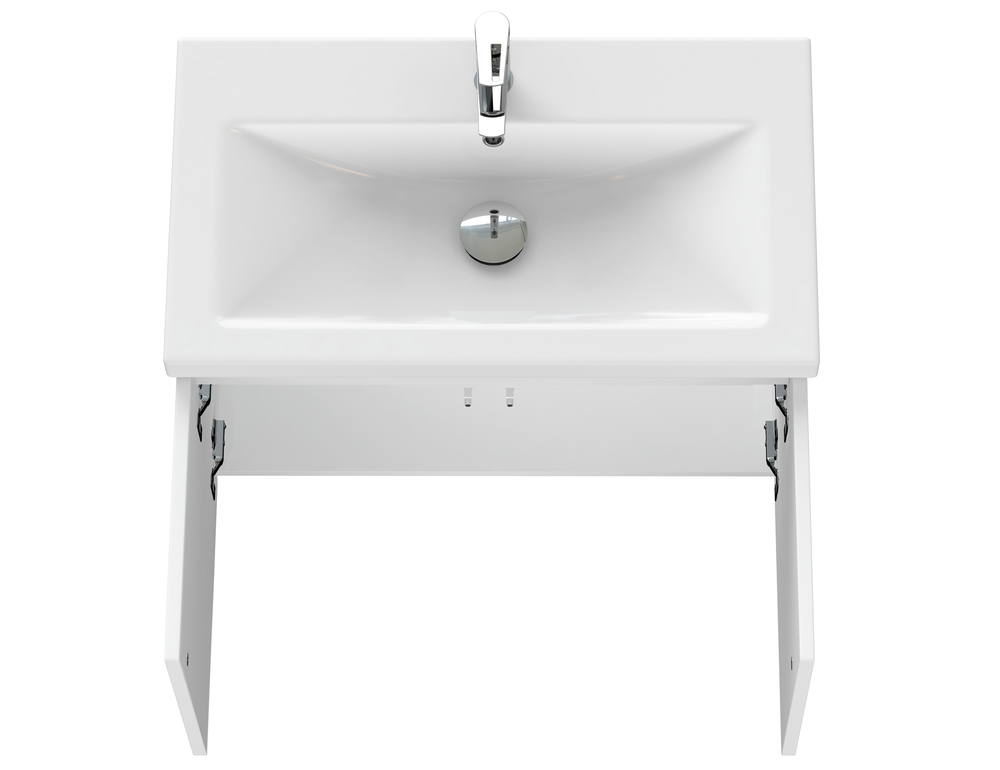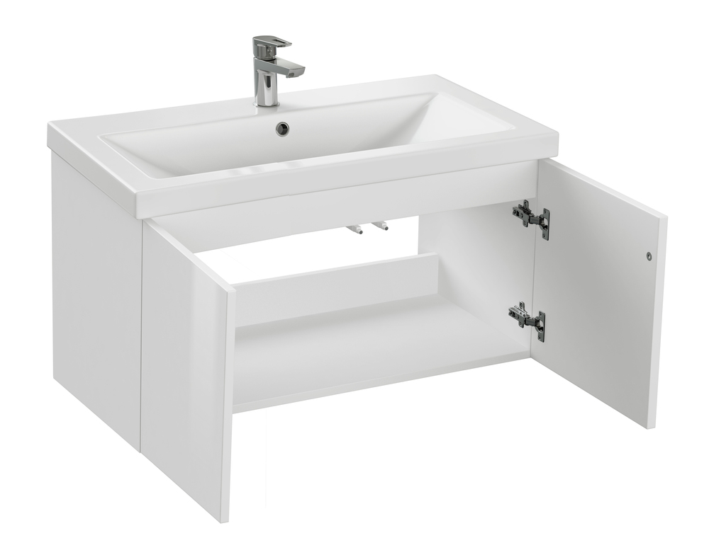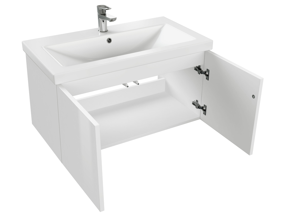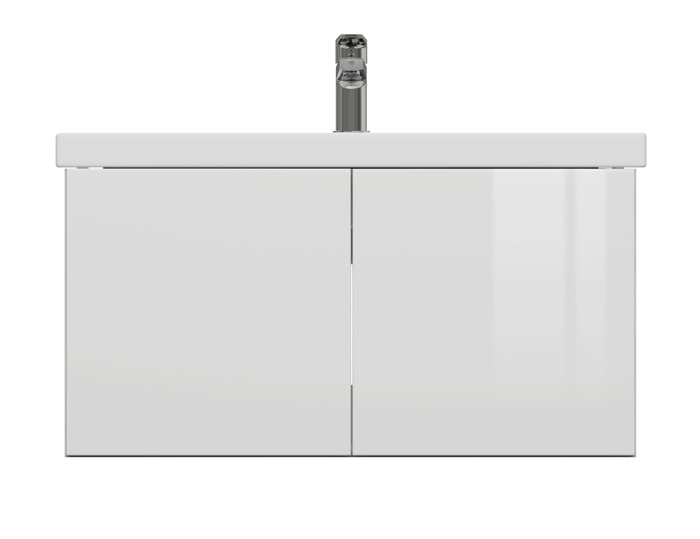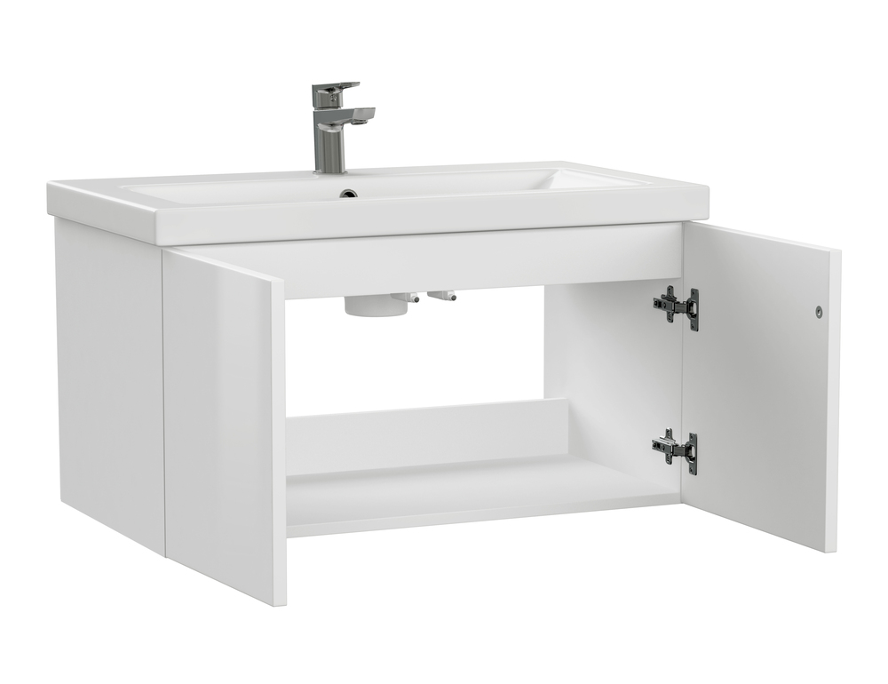 Белые глянцевые фасады, четкие геометрические формы тумбы помогут создать минималистичный и строгий интерьер ванной комнаты.
