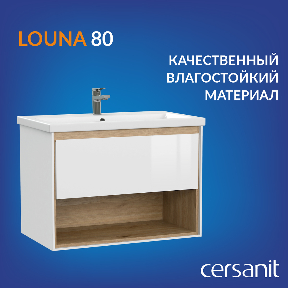 LOUNA – это коллекция, отвечающая последним тенденциям рынка: сочетание чистоты белого цвета и натурального дерева. Основной отличительной особенностью коллекции является её дизайн – сочетание белого с деревом, фрезерованная ручка, выдвижной ящик и удобная открытая полка для хранения. К тумбе рекомендуем раковины: СOMO80,MODUO80.