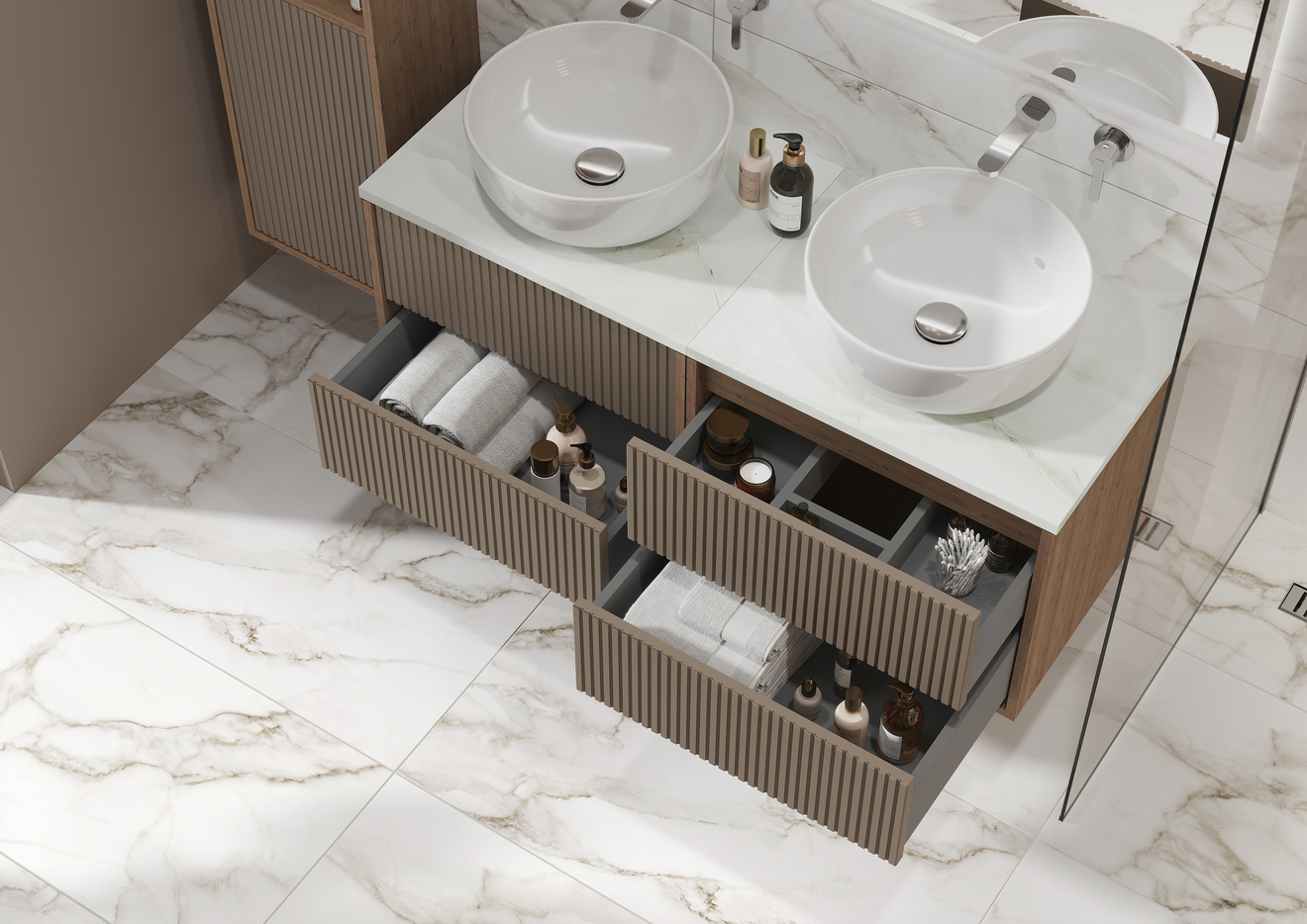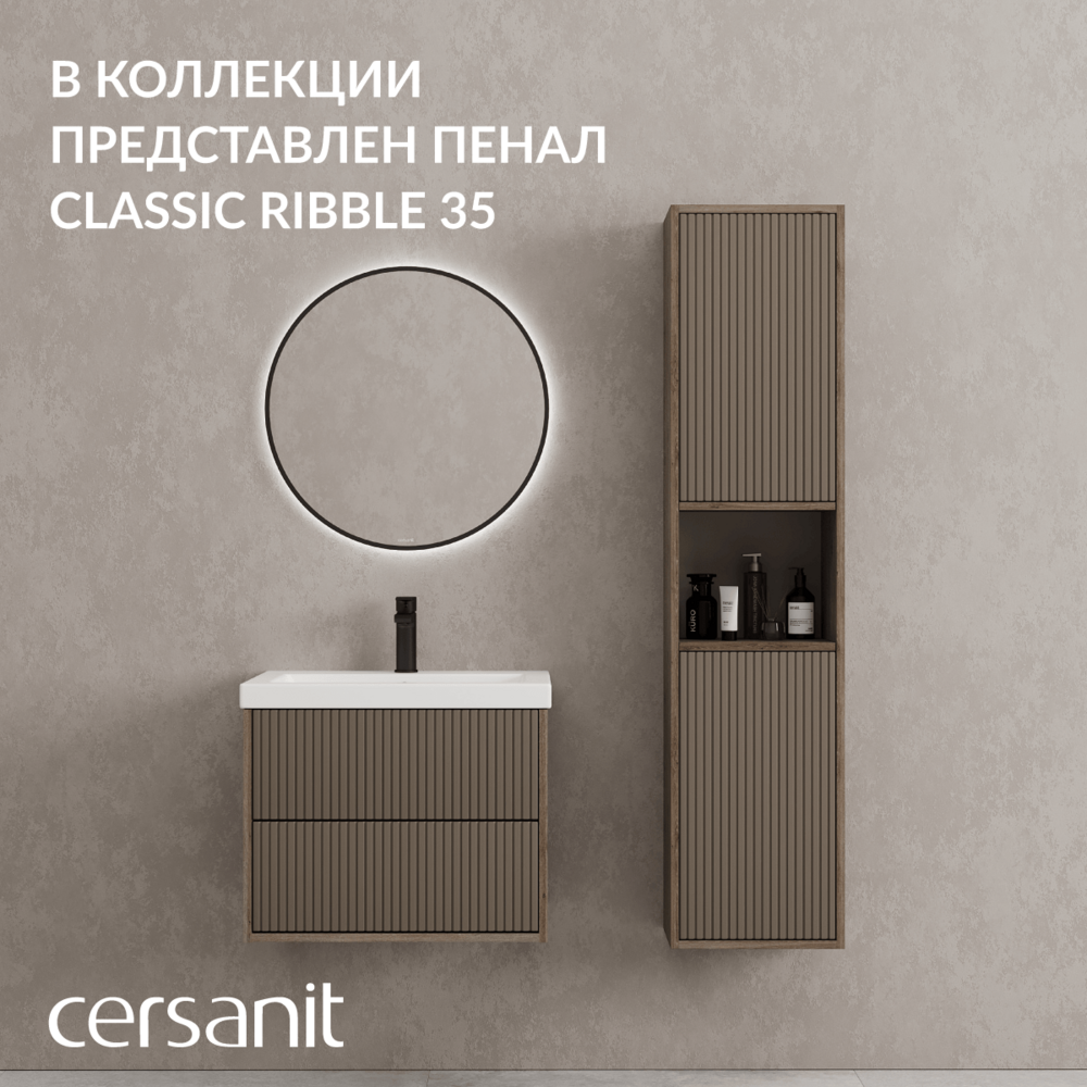 Classic Ribble — это продуманное дизайнерское решение, с которым легко создать единое эстетическое пространство. Мебель идеально сочетается с мебельными раковинами и столешницами с накладными раковинами, позволяя создать целостный и стильный образ ванной комнаты.