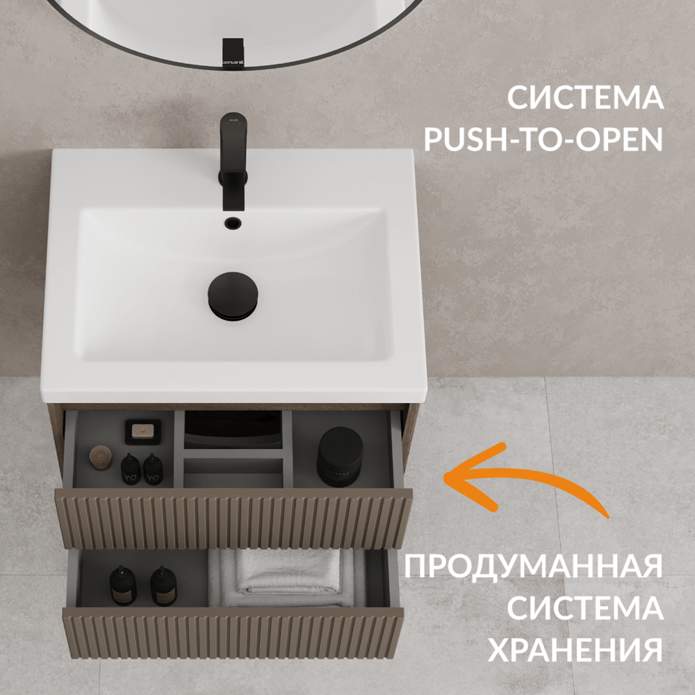 Тумбы оснащены удобными ящиками и продуманным внутренним пространством, которые помогут поддерживать безупречный порядок в ванной комнате. Ящики мебели с системой push-to-open открываются с помощью лёгкого нажатия.
