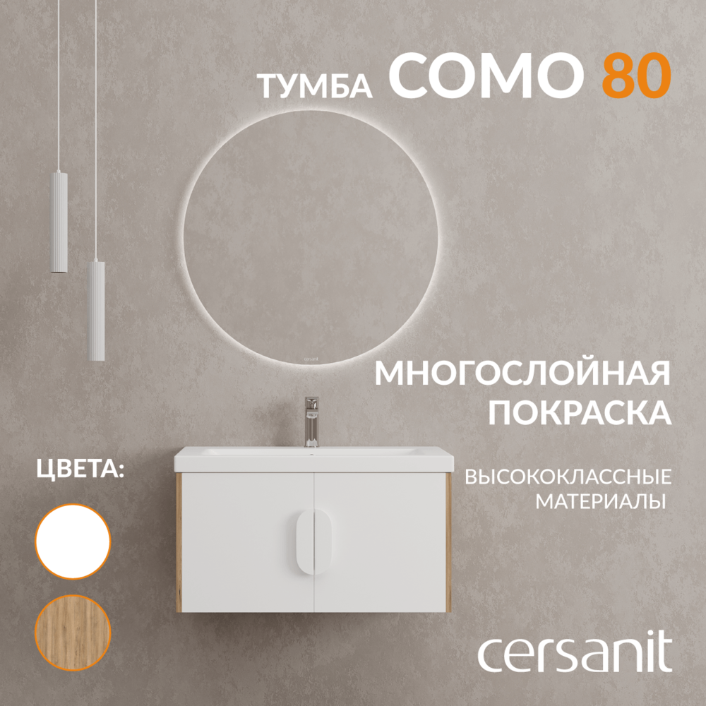 Тумбы для ванной комнаты Como прекрасны в своей гармоничной красоте. Дизайнеры Cersanit нашли баланс между чистотой форм и выразительностью характера этой мебели. Он достигается благодаря необычному сочетанию прямоугольной формы фасада и овала ручек. Благодаря их уникальной конструкции и удобному расположению в руке дверцы тумбы открываются ещё проще и комфортнее. Так коллекция обретает особое звучание, где все акценты сосредоточены на спокойствии и аккуратности.