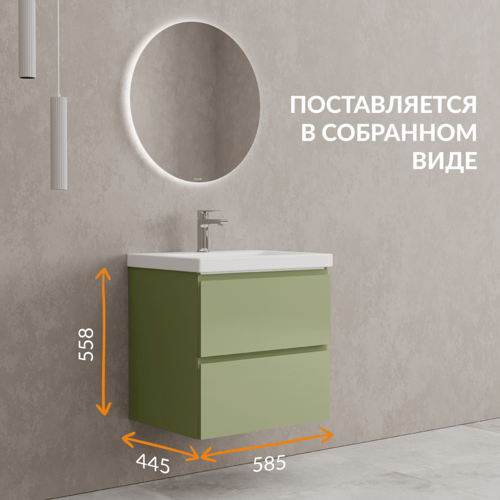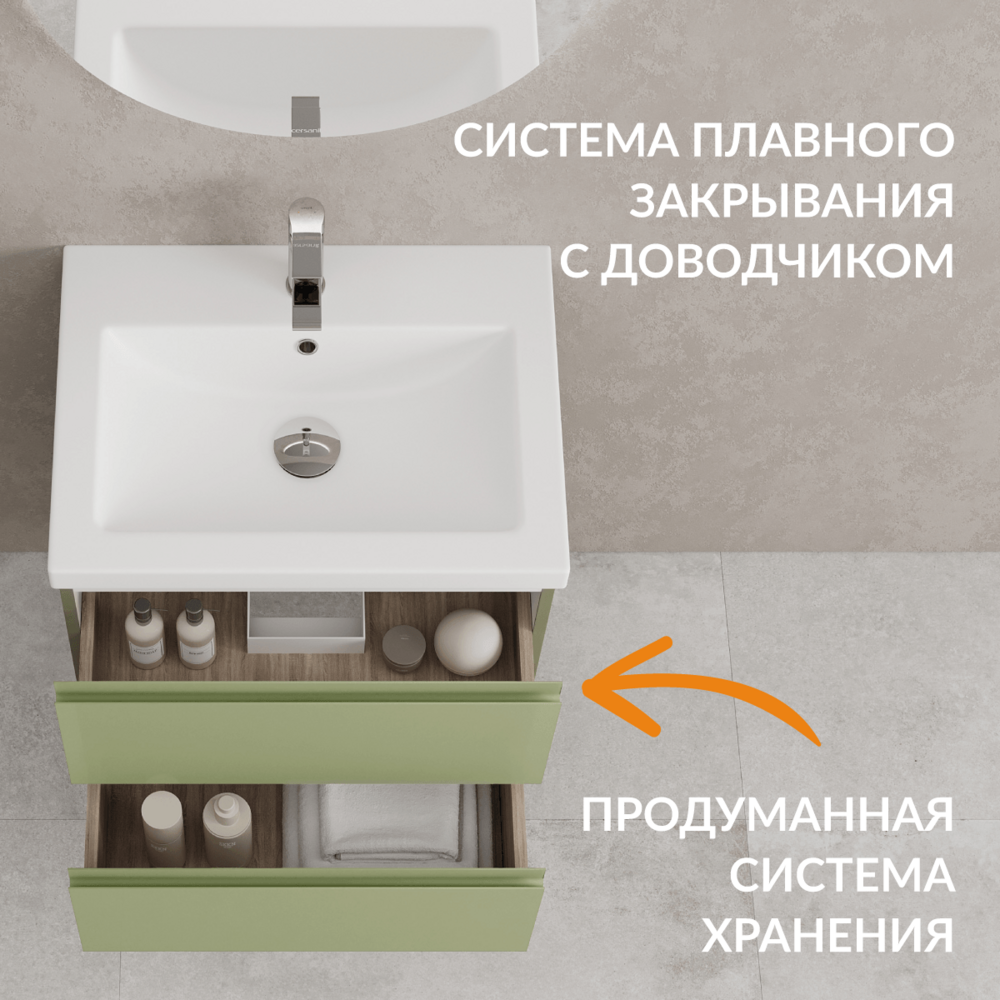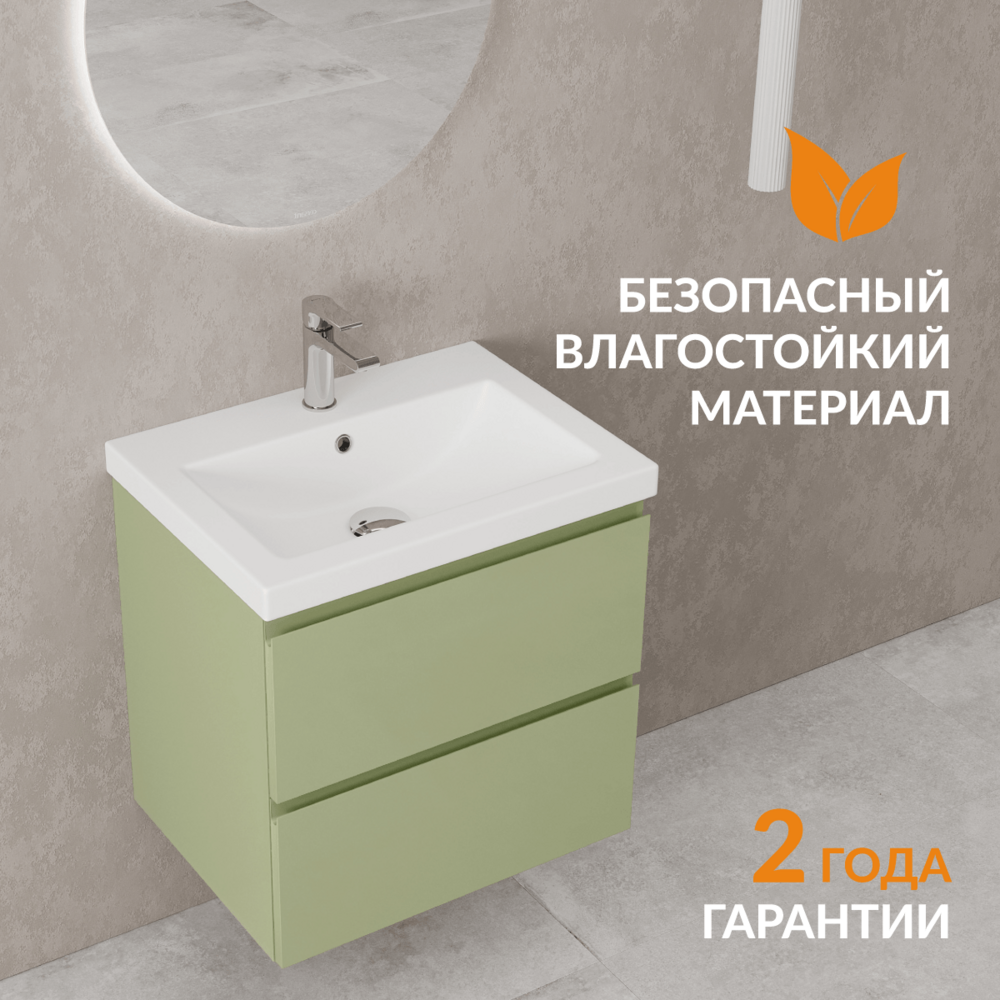Тумба Moduo в цвете «зеленый шалфей» вдохнет энергию жизни в интерьер вашей ванной комнаты. Свежее дыхание природы передает благородная матовая эмаль, которая наделяет глубиной и мягкостью этот оттенок. Цвет трендовой мебели, как листья ароматного шалфея, умиротворяет и наполняет жизнью всё вокруг. Благодаря спокойным оттенкам и стильной выразительности, Вы точно создадите идеальный интерьер своей ванной комнаты.