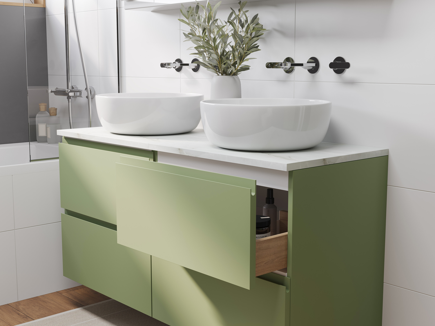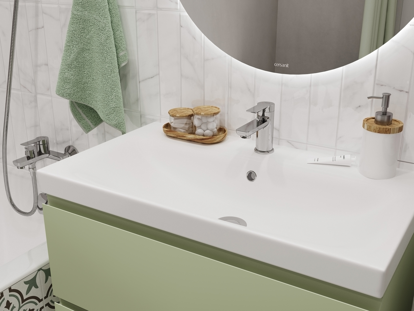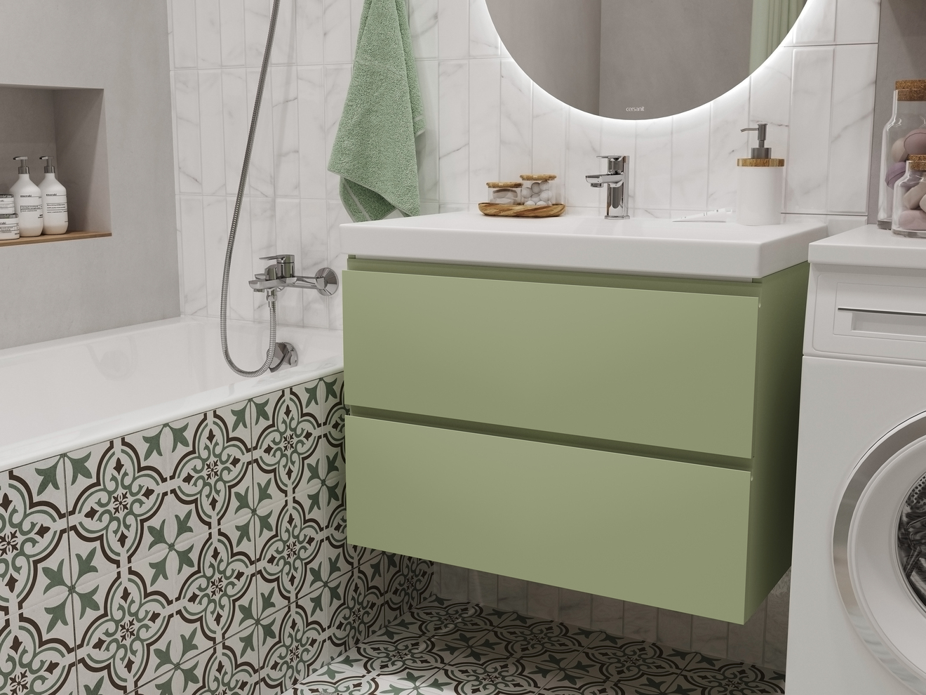 Тумба Moduo в цвете «зеленый шалфей» вдохнет энергию жизни в интерьер вашей ванной комнаты. Свежее дыхание природы передает благородная матовая эмаль, которая наделяет глубиной и мягкостью этот оттенок. Цвет трендовой мебели, как листья ароматного шалфея, умиротворяет и наполняет жизнью всё вокруг. Благодаря спокойным оттенкам и стильной выразительности, Вы точно создадите идеальный интерьер своей ванной комнаты.