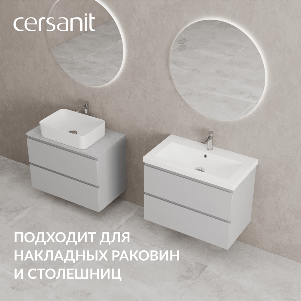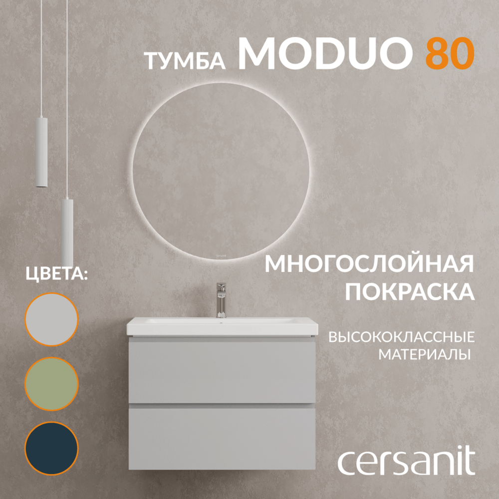Тумба Moduo в цвете «серый туман» — это воплощение сдержанной элегантности и современного дизайна. Матовая текстура, мягко рассеивая свет, дарит поверхности благородную глубину оттенка. Трендовый цвет, как утренний туман над водой, спокойный, естественный и гармоничный. Все эти качества он дарит ванной комнате, превращая ее в помещение для расслабления.