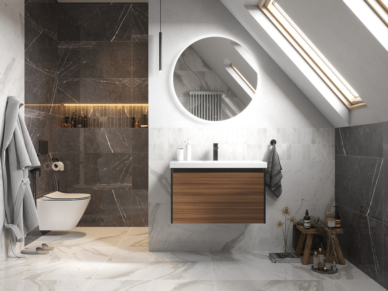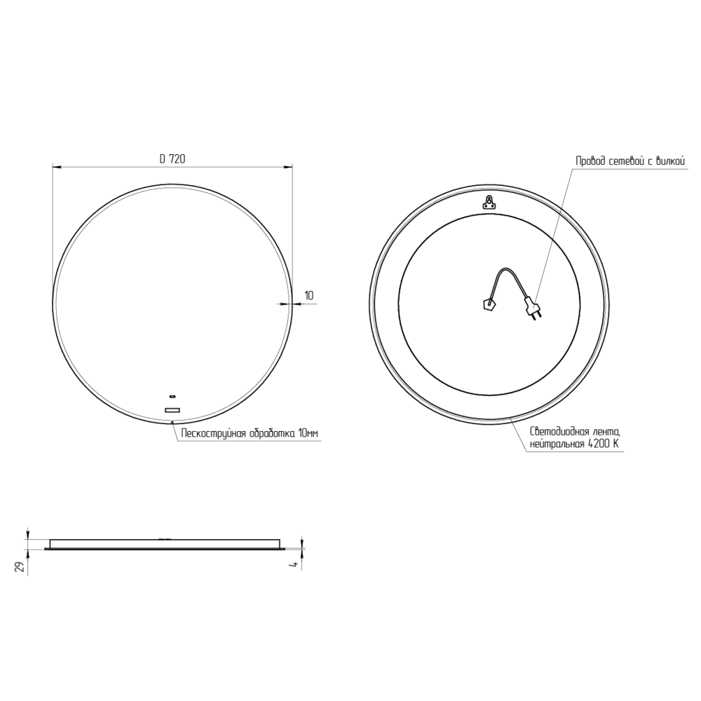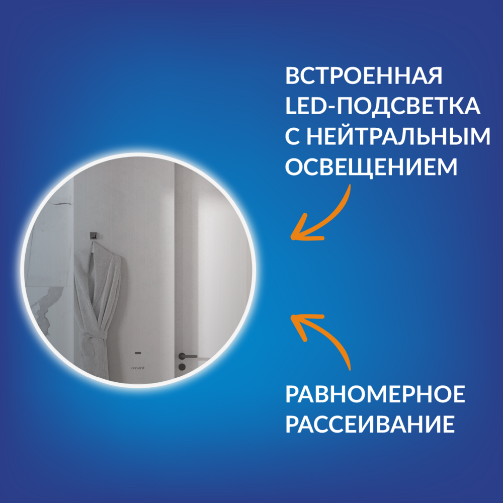 Светодиодная подсветка с приятным нейтральным оттенком создаёт эффект парения. Она вмонтирована в торец зеркала и дополнительно закрыта силиконовой вставкой, благодаря чему свет равномерно рассеивается в пространстве, а оборудование получает дополнительную защиту от влаги.
