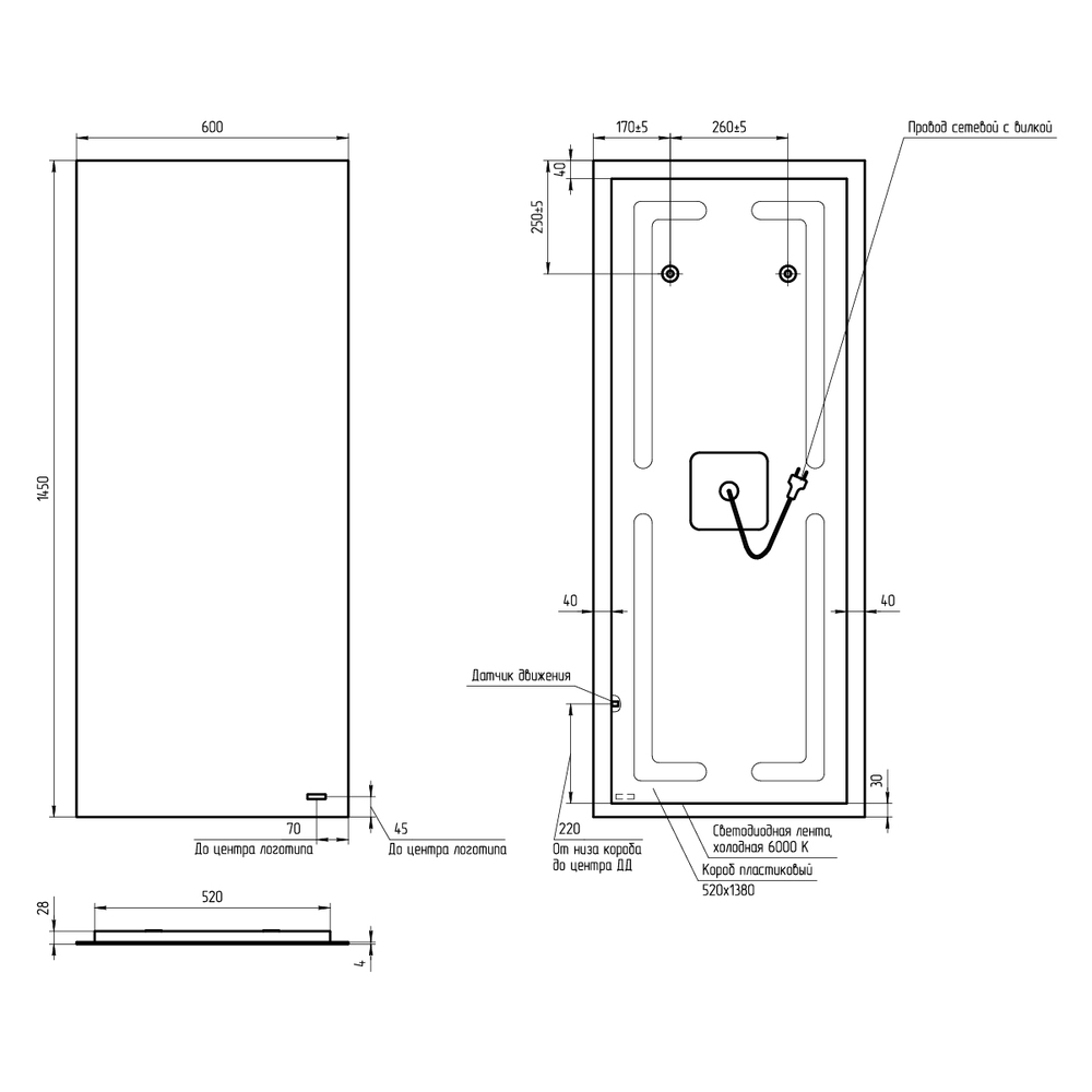 Зеркало ECLIPSE smart 60х145 с подсветкой прямоугольное (чертеж)