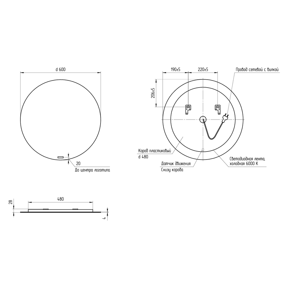 зеркало с подсветкой, комплект креплений, инструкция, гарантийный талон