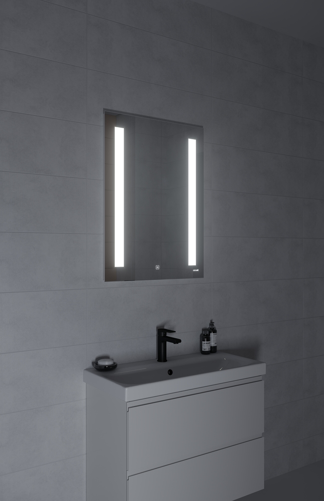 Модель Led 020 Base оснащена встроенной подсветкой, расположенной двумя широкими полосками по краям полотна. Она включается с помощью сенсорной кнопки. Благодаря ей комфортнее проводить гигиенические процедуры, а также зеркало можно использовать вечером как дополнительный источник мягкого света.