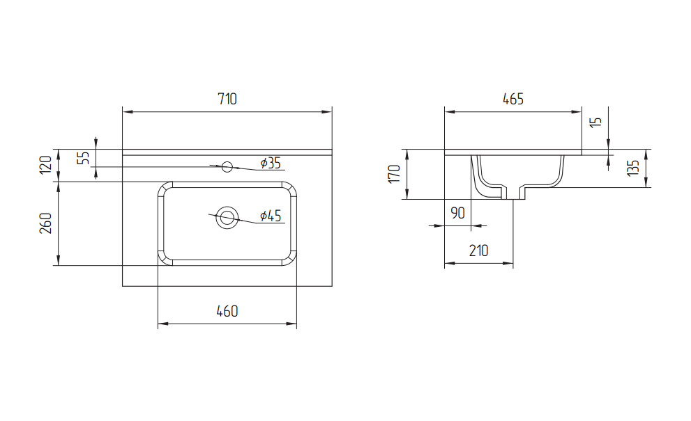 Прямоугольная мебельная раковина ESTETICA с тонким бортом и отверстием под смеситель. Ширина раковины 70 см.