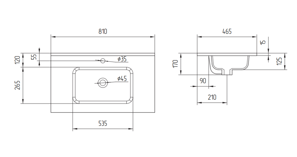 Прямоугольная мебельная раковина ESTETICA с тонким бортом и отверстием под смеситель. Ширина раковины 80 см.