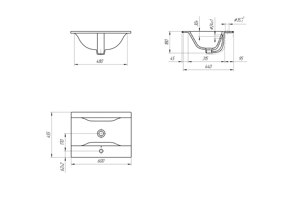 Тонкая раковина Ontario с отверстием под смеситель, размером 60 см. Может устанавливаться на тумбу и на столешницу.