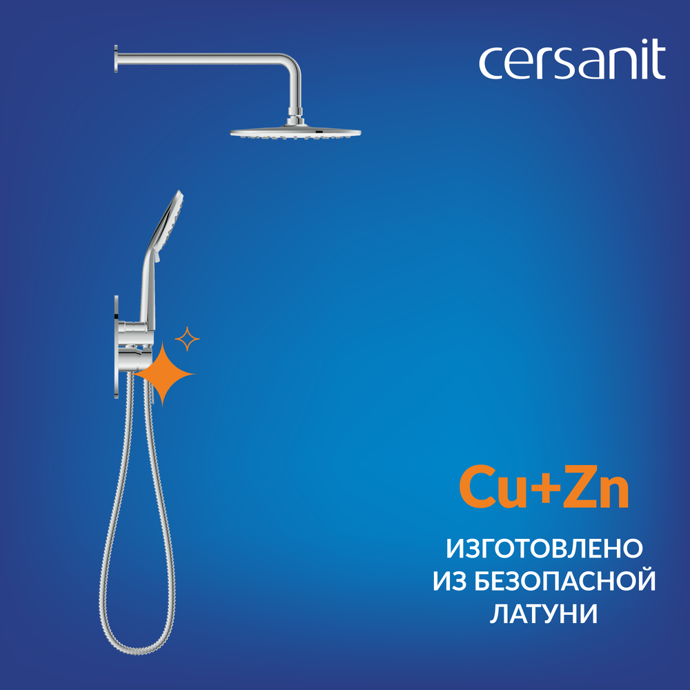 В составе гарнитура надёжный и долговечный латунный смеситель, который защищен изнутри от перепадов давления благодаря высокому содержанию меди в составе. Внутри керамический картридж, рассчитанный на 500 000 циклов использования и точно смешивающий воду.