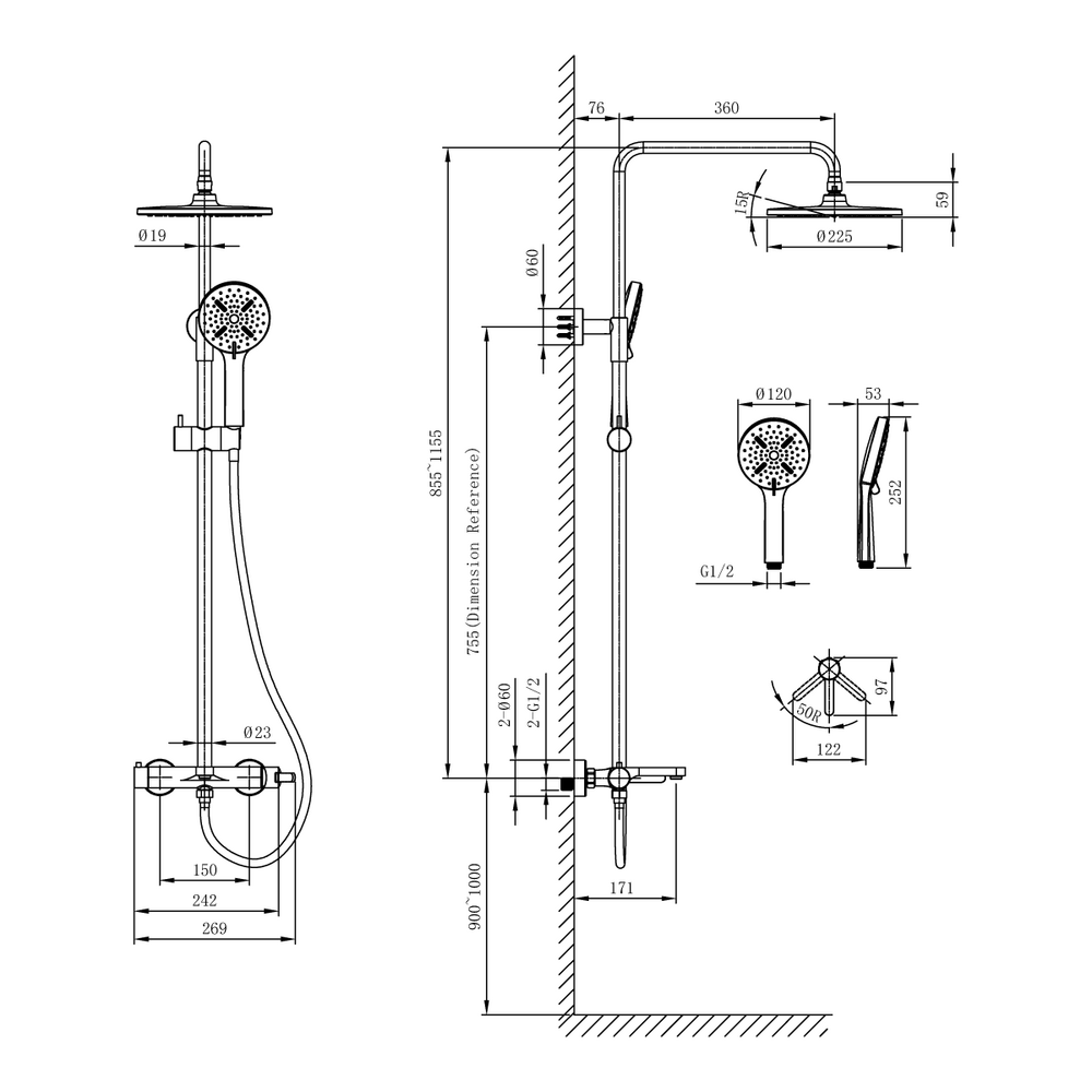Смеситель 1 шт. Лейка для душа 1 шт. Держатель для лейки 1 шт. Тропический душ 1шт. Шланг для душа 1/2",, 1 шт. Стойка 1 шт. S-образный эксцентрик 1/2", 2 шт. Декоративный отражатель 2 шт. Прокладка 2 шт. Комплект крепления 1 шт. Инструкция по эксплуатации 1 шт. Гарантийный талон и паспорт изделия -1 шт .