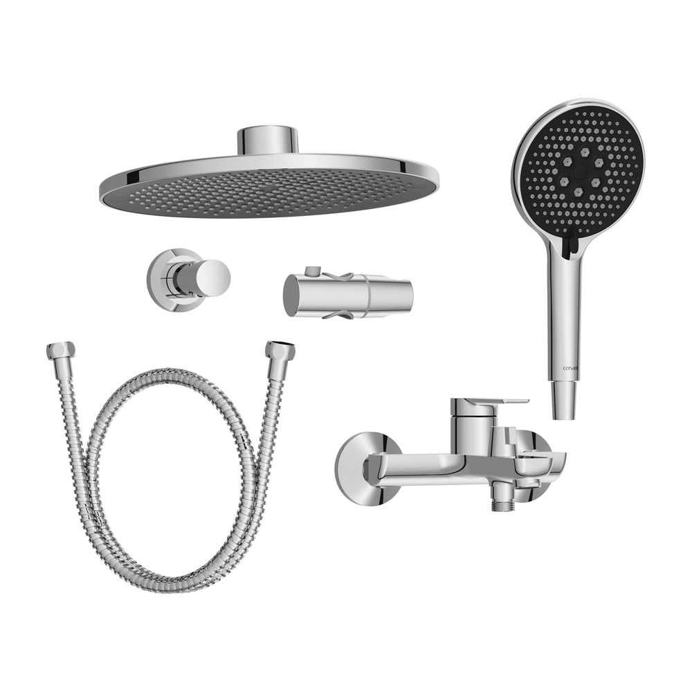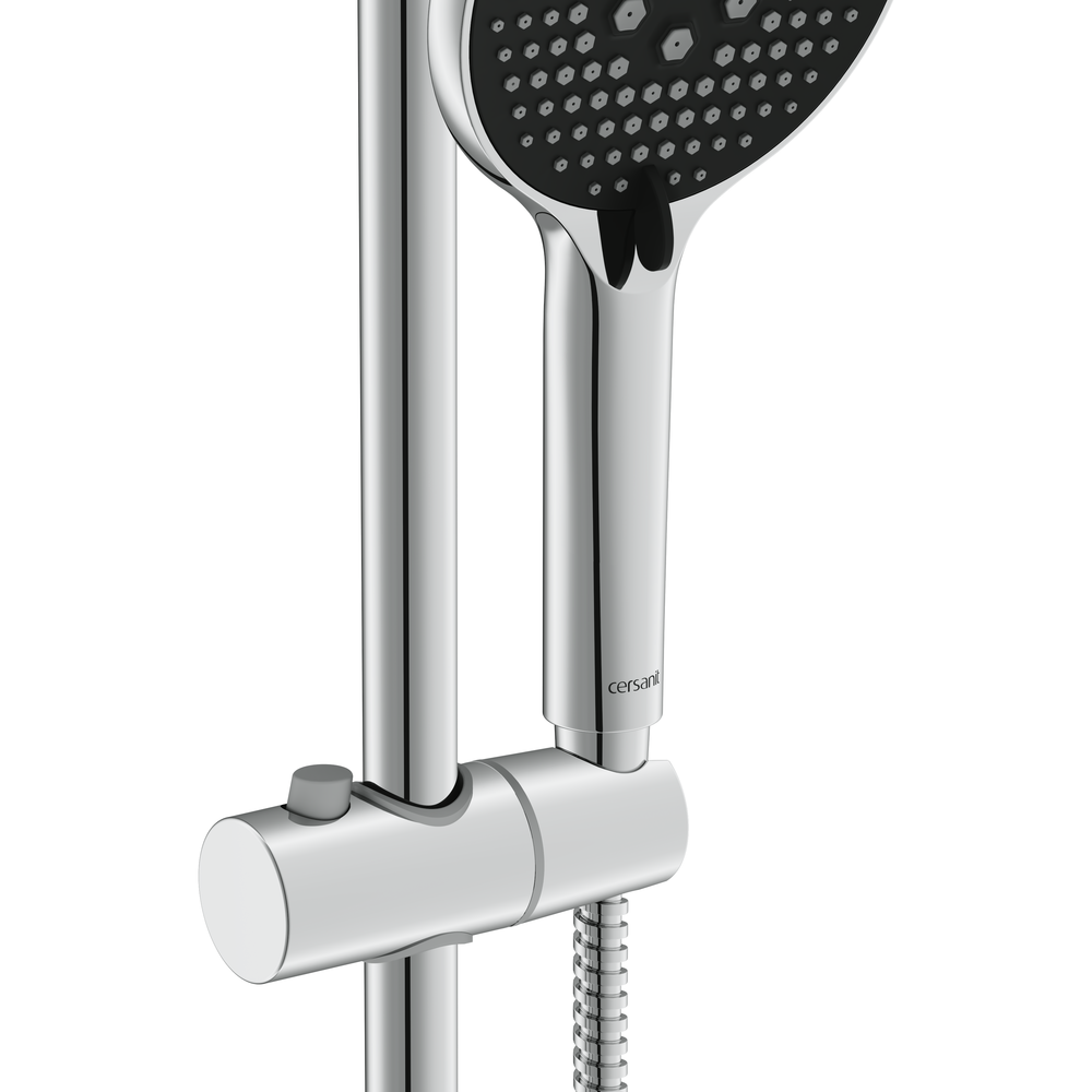 Система также оснащена крупной душевой лейкой с 3 режимами рассеивания потока, которую можно установить на передвижной держатель. Технология Cersanit Easy Clean обеспечивает быстрое очищение силиконовых форсунок от известкового налета. Для этого достаточно просто провести пальцами по форсункам. Шланг оптимальной длины 1,5 м не сковывает движений.