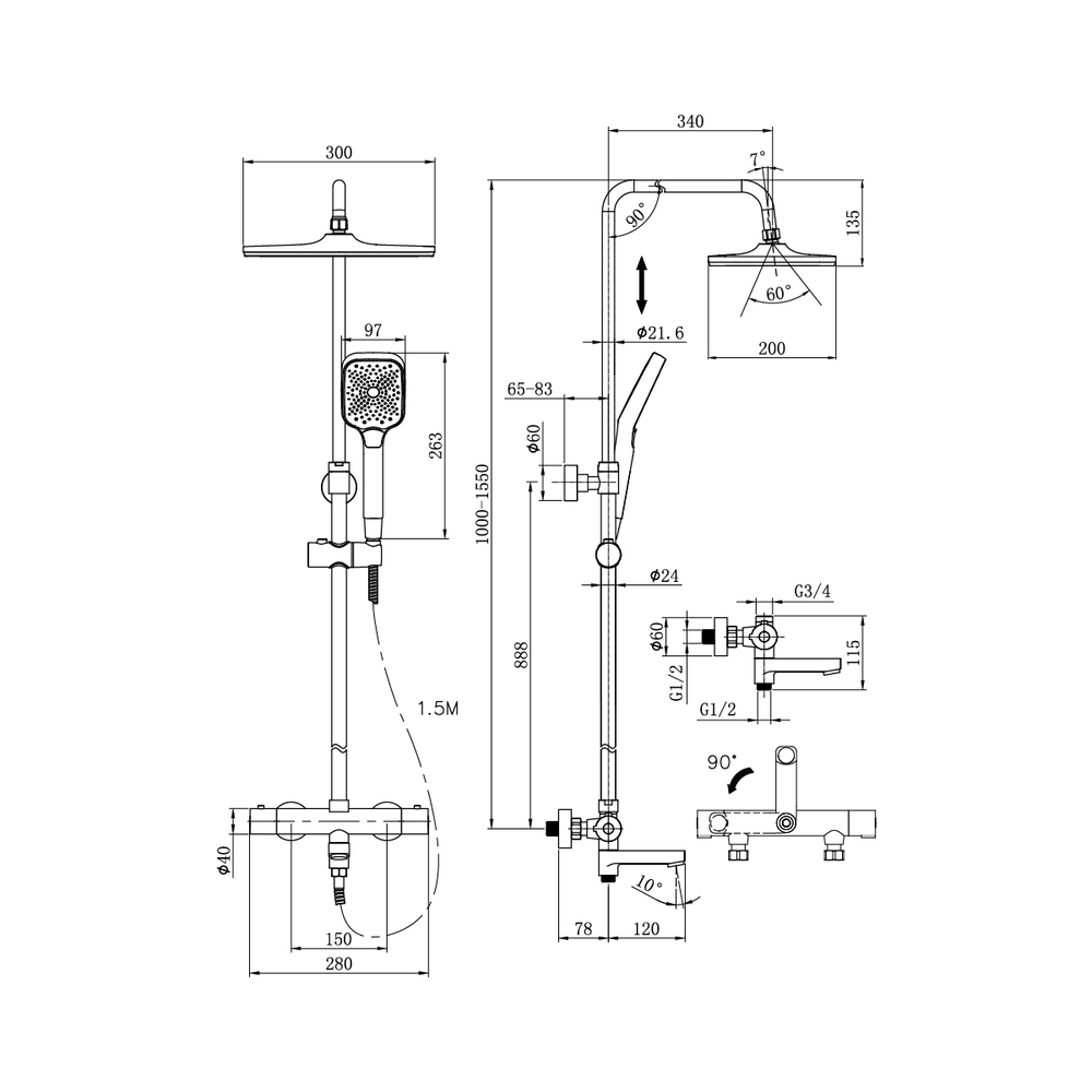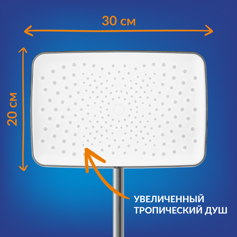 • Наклон лейки тропического душа можно менять с помощью шарнирного механизма, а штанга регулируется по высоте;