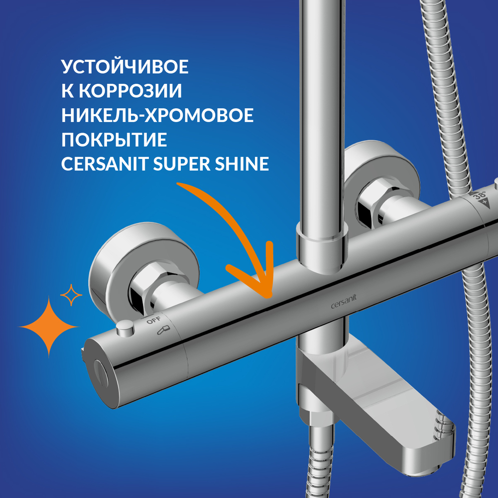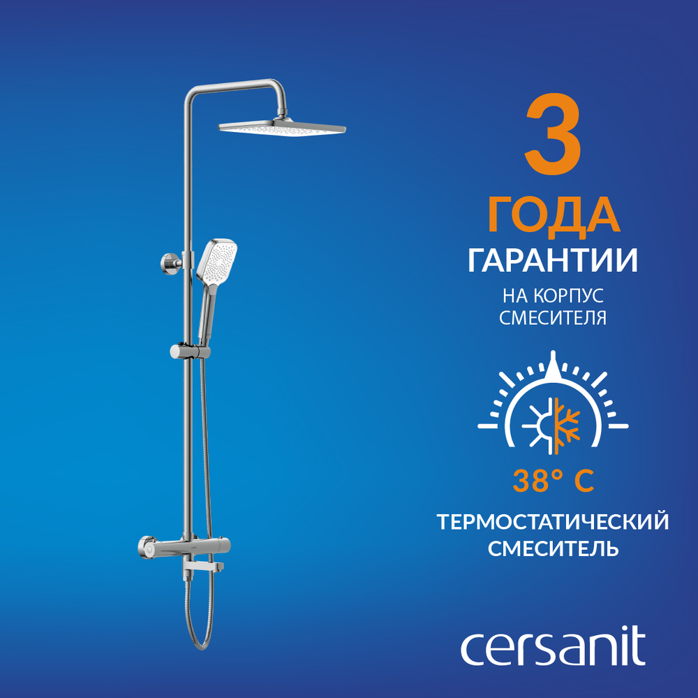 Термостатические смесители идеально смешивают воду и обеспечивают подачу потока установленной температуры. Разработка Cersanit чутко реагирует на колебания температуры воды в диапазоне трёх десятых секунды, благодаря чему душ остаётся стабильно тёплым, даже если в трубах меняется давление или в доме одновременно работают несколько устройств с потреблением воды.