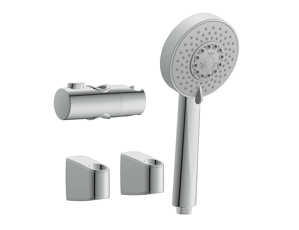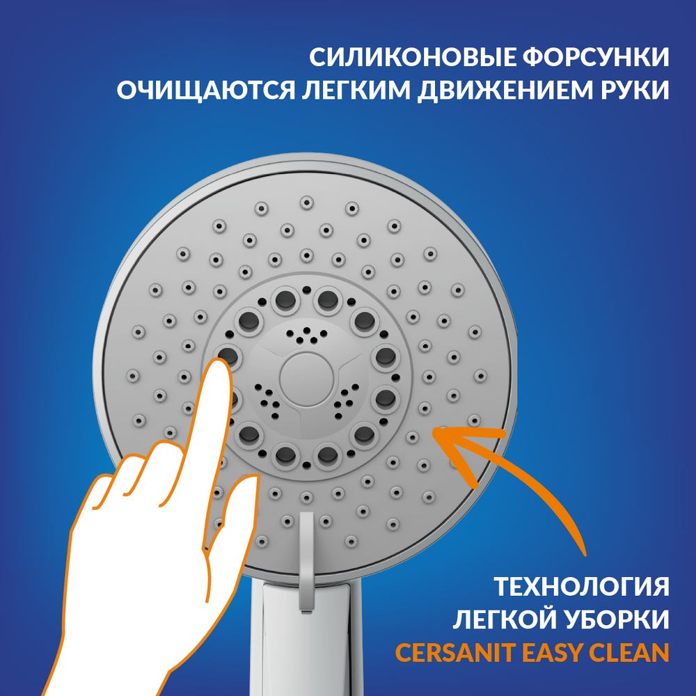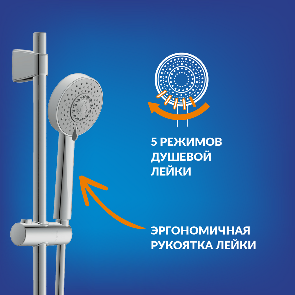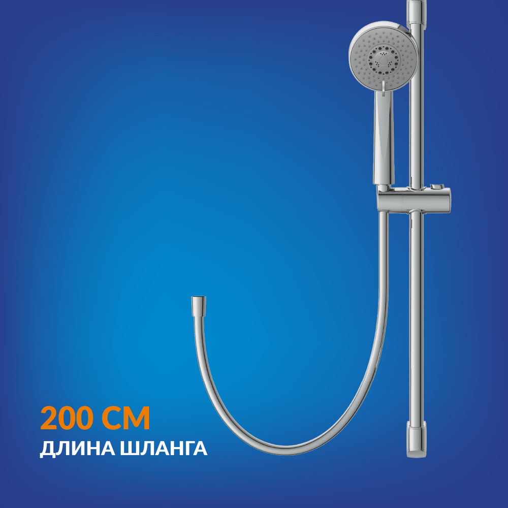 Гарнитур состоит из 11-сантиметровой лейки с 5 режимами подачи воды и стойки с передвижным держателем лейки. С его помощью душ удобно фиксируется на нужной высоте.