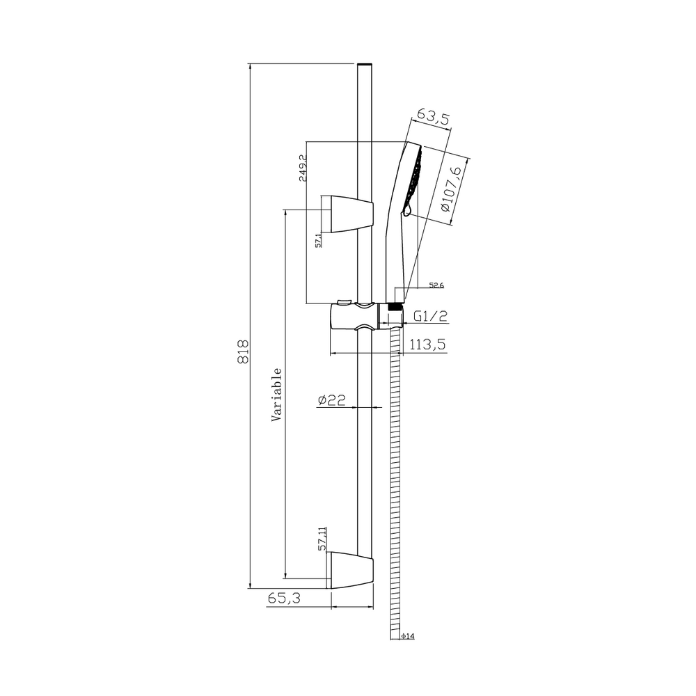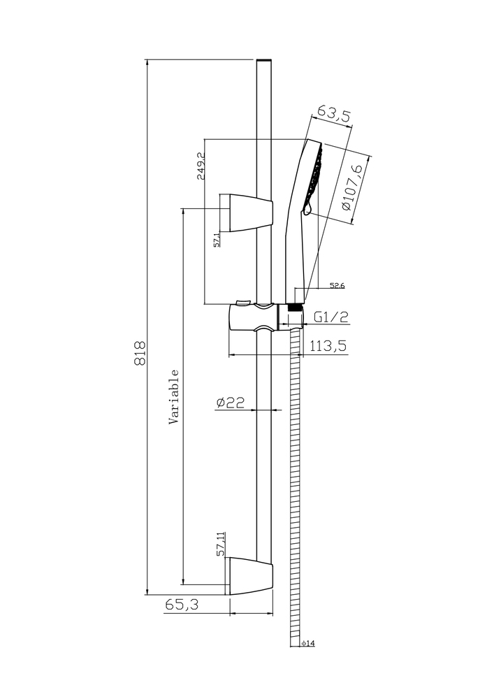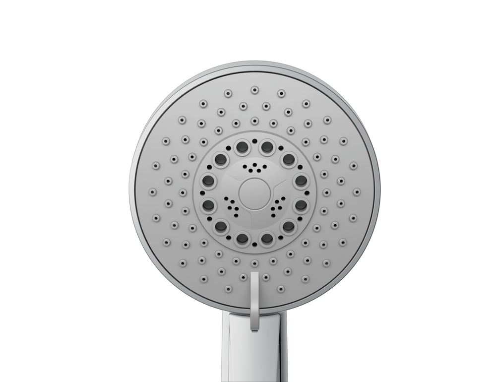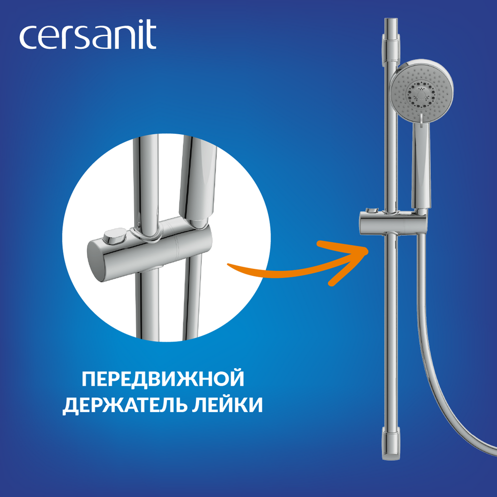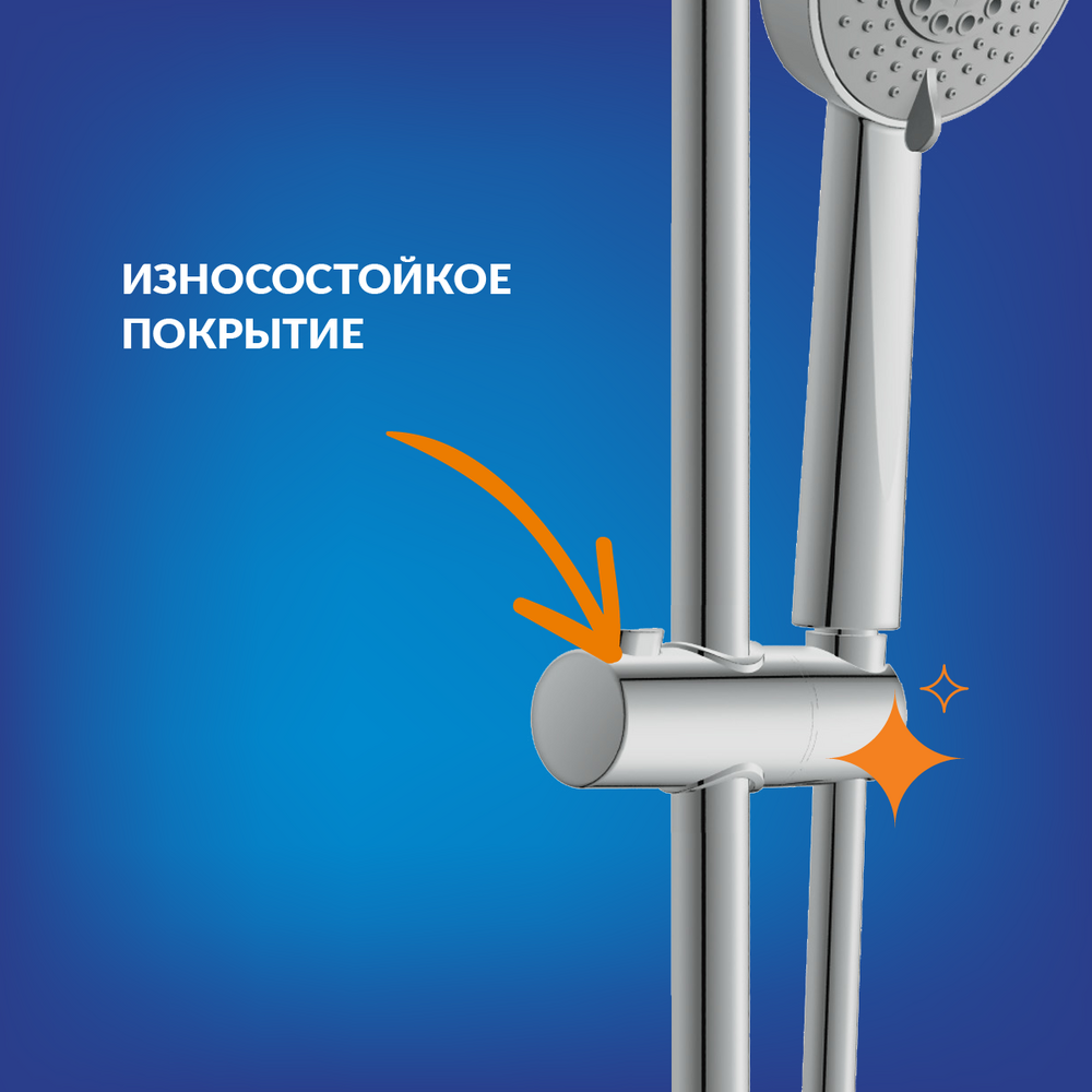 Гарнитур состоит из 11-сантиметровой лейки с 5 режимами подачи воды и стойки с передвижным держателем лейки. С его помощью душ удобно фиксируется на нужной высоте.